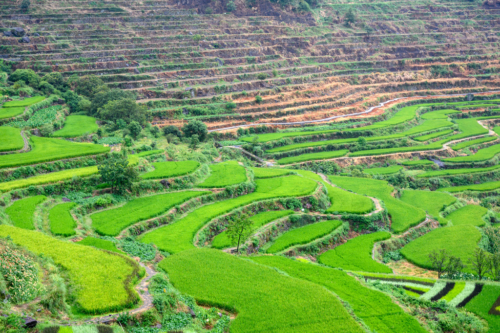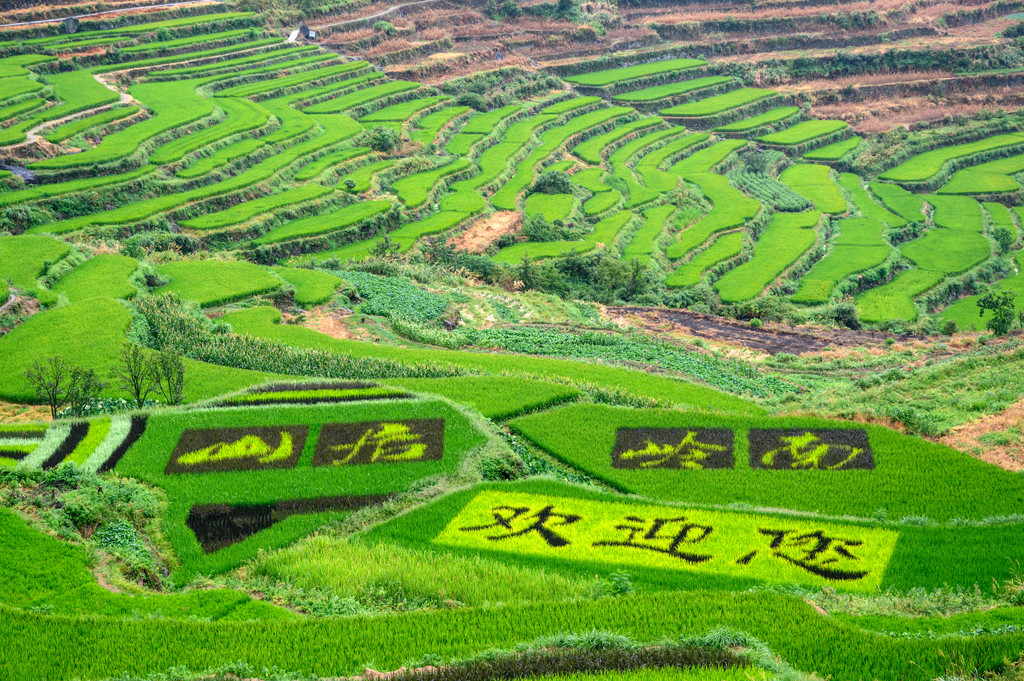 春季的时候,千亩梯田中种植有油菜花,其余季节则种植水稻,春季的覆卮山千年梯田格外的美,那时也是这里最热闹的时候,吸引了周边众多游客的慕名而来。虽然这个季节正是水稻的季节,放眼望去绿油油的一片,虽然无法与黄灿灿的油菜花相比,但景色也毫不逊色。