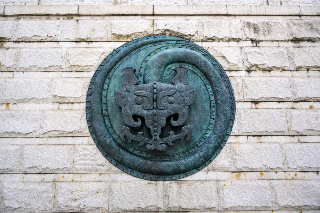 穿过山门又间一座开阔的广场,广场两侧为南北配殿,在广场和正对着的墙壁上各有一块青铜雕刻,其中台阶处的青铜雕刻为“夔龙圆盘”,镶嵌于照壁之上,在汉代时许多寺庙就多用夔龙装饰,可以起到驱妖避邪的作用,同时也给人一种神秘而威严的氛围。