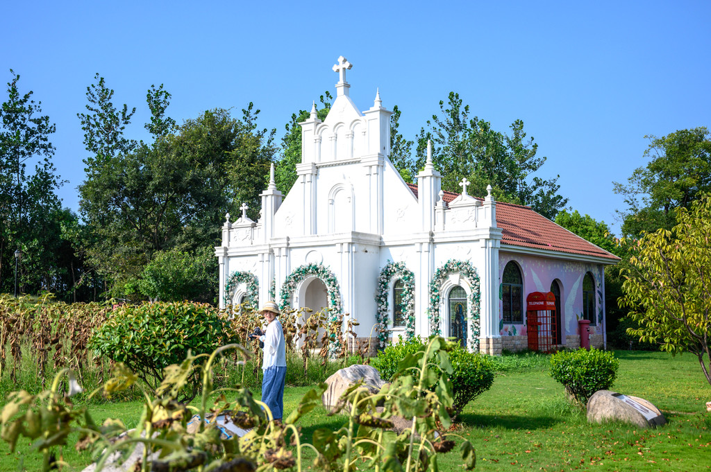 白色的教堂掩映在绿意盎然的田园中,这里是举办草坪婚礼的地方,白色象征着爱情的坚贞不渝,教堂赋予爱情神圣而又纯洁,教堂前还有大片的向日葵,待向日葵盛开的季节,在这里举办婚礼一定格外浪漫吧。