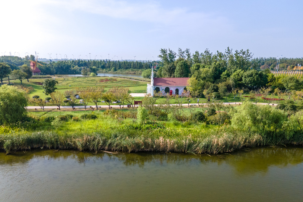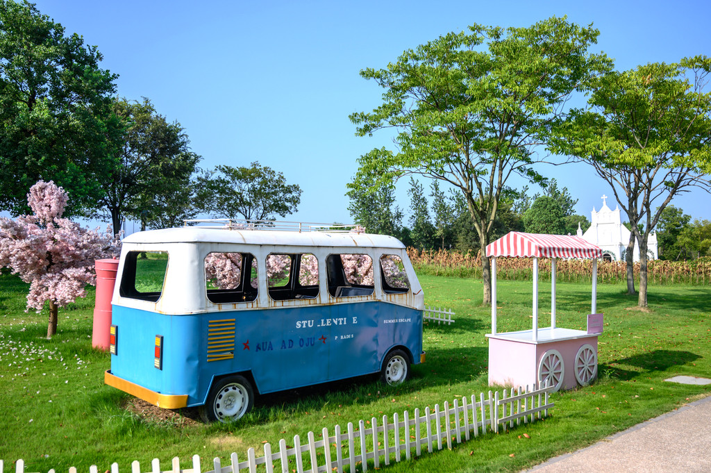 杭州湾海上花田景区的景色非常精致,从这里的布局设计就可以看出来,环湖是大片大片的草坪、田园,田园内种植着四季花海,草坪上有复古小面包车、邮筒、花车,周边还点缀有欧式教堂及荷兰风车,随手一拍就是一张自带ins风的唯美照片,对于情侣来说这里真的太适合了。