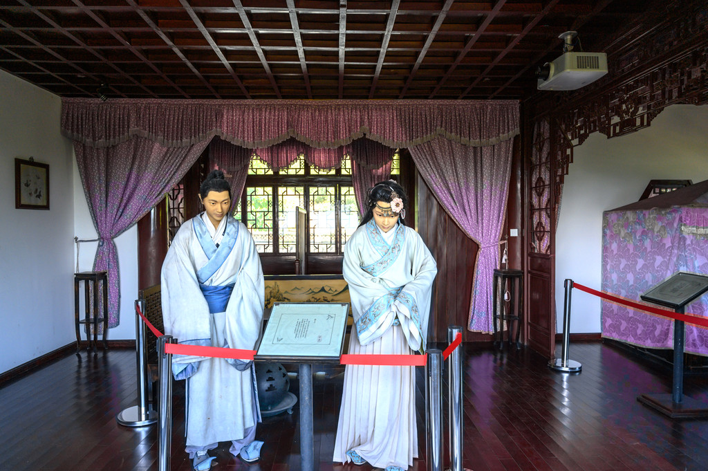 在二楼可以看到梁山伯与祝英台的人物蜡像,其穿着皆为东晋时期人物的服饰特征,这里就是“楼台会”的发生地,为了让大家了解这段故事,一旁还设有投影设备,播放的就是“楼台会”。