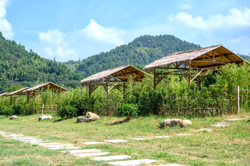 溪边还有一座烧烤基地,当然这个季节是没有人愿意坐下来吃烧烤的,但春秋季节来这里烧烤绝对非常爽,烧烤摊位也非常有特色,一个个茅草棚点缀在绿水青山间。