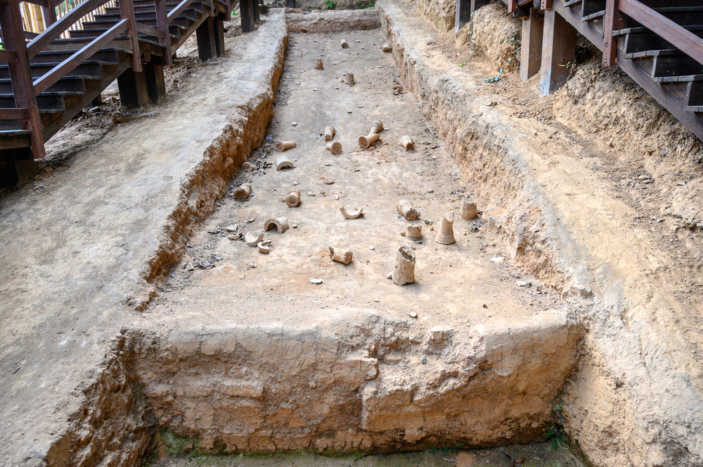 这个窑炉为三国龙窑,长13.2米,是目前早期龙窑中保存最为完整的一个,龙窑的火膛、窑床和窑尾三部分都保存比较完好,在这座龙窑中还出土了少量的碗、罐、洗等青瓷碎片,瓷片的胎釉质量非常高。