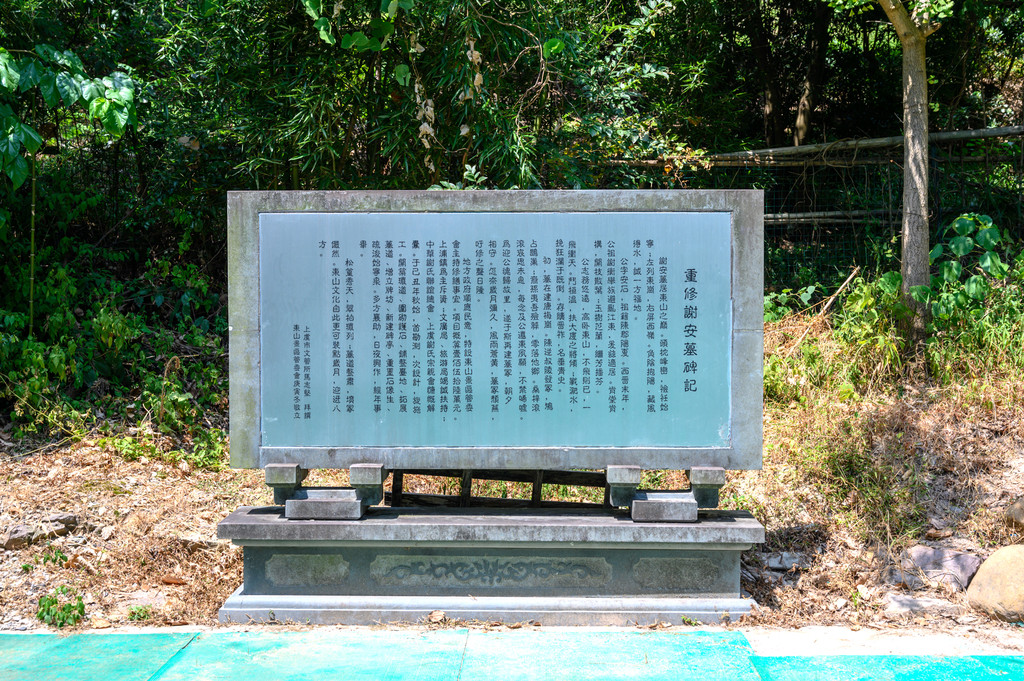 穿过碑亭,即可看到谢安墓,墓前立有一块石碑,石碑上刻有“晋太傅谢公墓”六字,墓园为绛红色岩石砌筑而成,碑前置有香炉石桌,墓后翠柏幽篁相拥,环境幽静且庄重,在墓园旁还有一块石碑,为《重修谢安墓碑记》,大致记载的就是:谢安墓最初时在南京梅岗,后遭到破坏而被后人重葬在上虞东山。