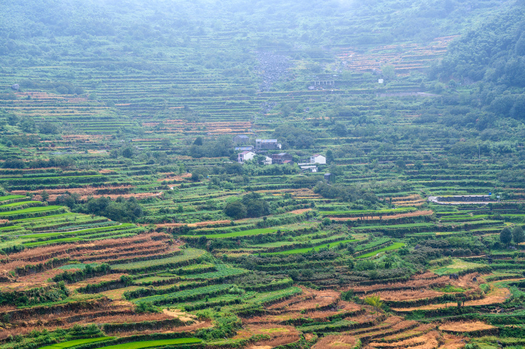这是我第一次到覆卮山景区游玩,没想到景区规模还挺大,拥有千年梯田、百年古村东澄、冰川石浪、上虞第一高山等景点,到达覆卮山景区后第一站去的千年梯田,当然夏季并不是梯田最佳的观赏季节,春天油菜花盛开时才是梯田最美的季节,更何况我们到时还在下着小雨。