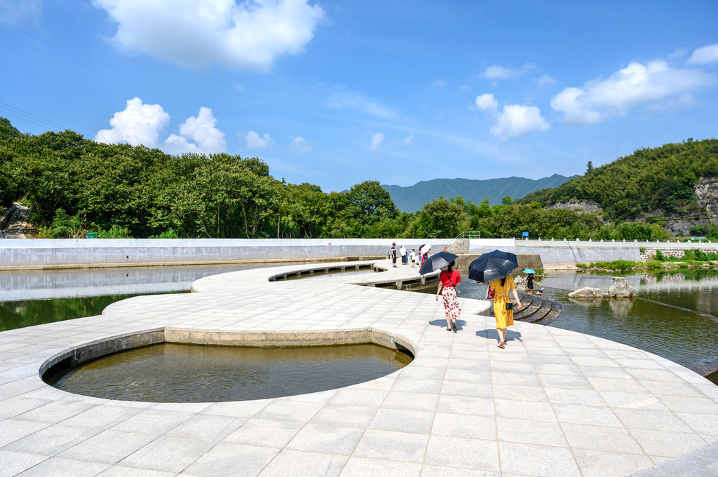 鲤鱼坝坝体上非常宽敞,且设置有两处可直接观看到溪水的空间,其实是鲤鱼的眼睛和身体,大家可以坐下来或者光着脚丫子戏水,那感觉一定非常凉爽、奇妙,不失为上虞的避暑胜地。