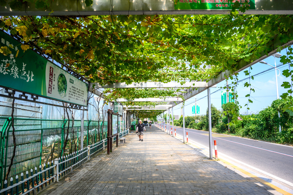 最后一站我们来到素有“江南吐鲁番”之称的盖北镇,地处上虞东北部,距离上虞城区约15公里,开车大约30分钟就可以到这里。盖北镇是我国特色农业名镇,尤其是这里种植的“一果两菜”闻名长三角,即葡萄、榨菜和芥菜,尤以“盖北葡萄”最负盛名,为著名的“中国葡萄之乡”,从走进盖北镇时就可以看到马路两边众多的葡萄园。