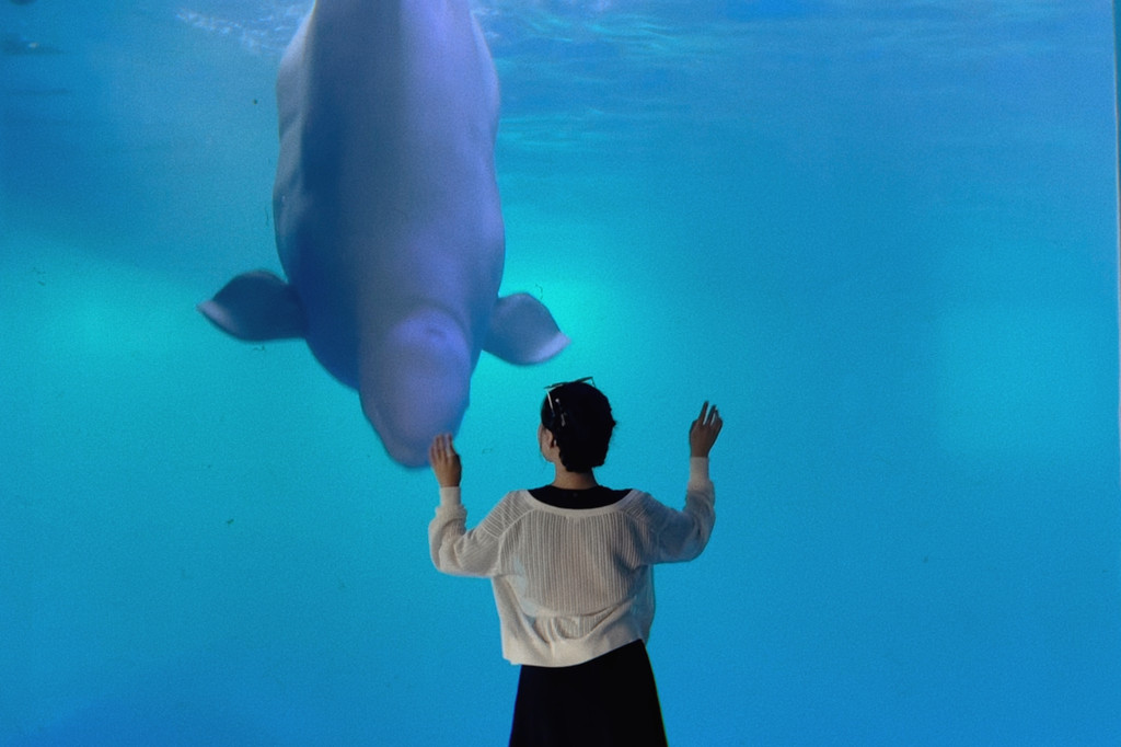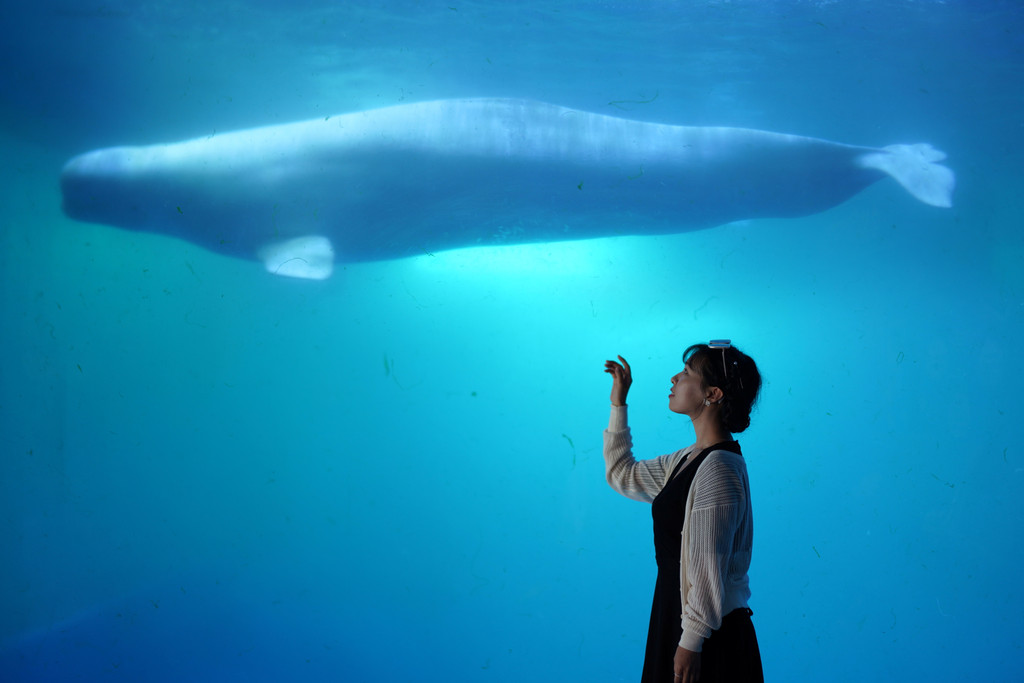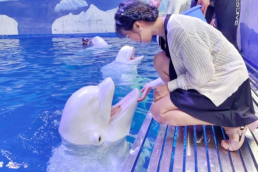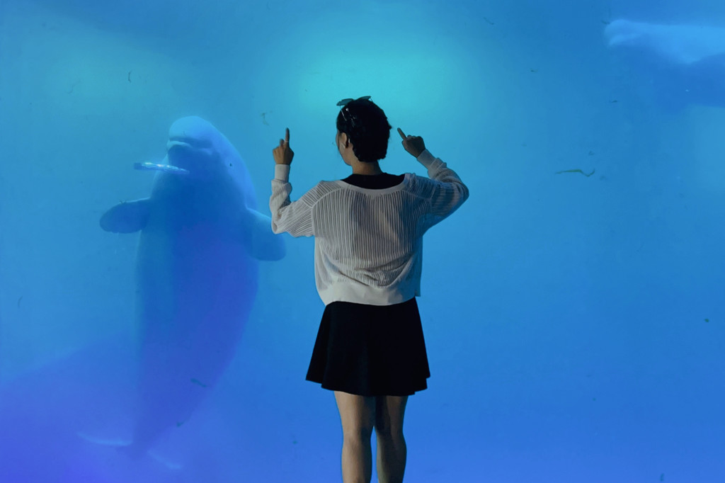 我最喜欢的表演,音乐响时,白鲸们会随着音乐的节拍,时而高唱着歌,时而翻身,时而顶着训练员玩……真是千姿百态!在没有表演的时候,白鲸馆里也非常值得来,幸运的话,还能看到它们特地为你吐得泡泡哦~