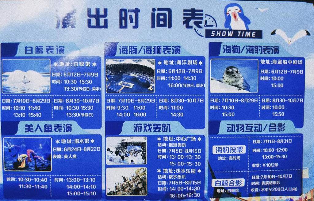 需要注意的是,在白鲸馆和海洋剧场有动物表演,分别是: