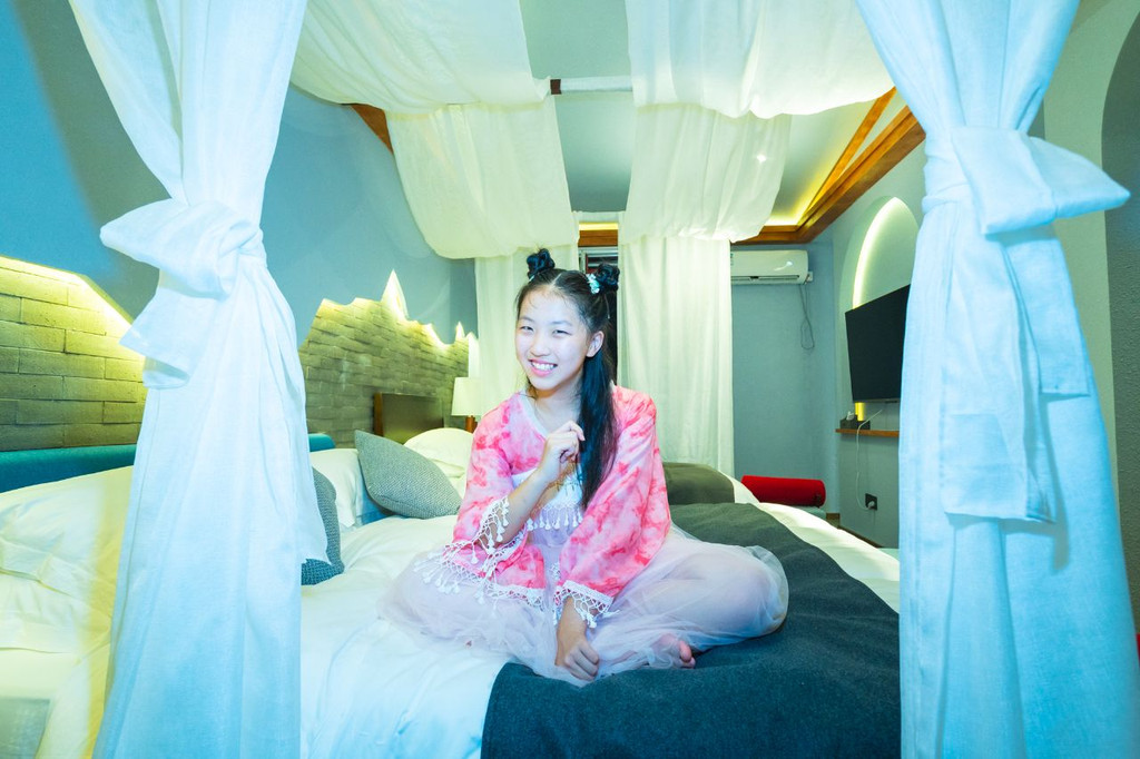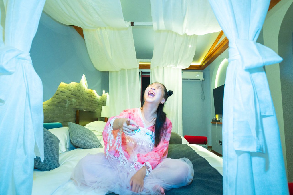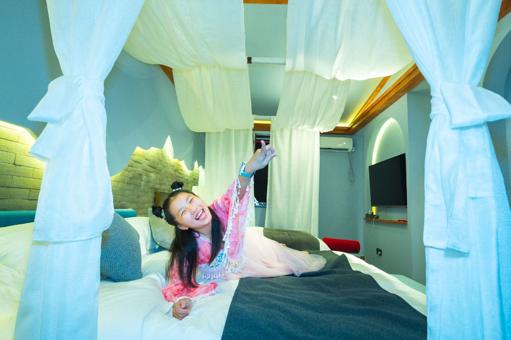 我与女儿入住龙武帐,这是以孙承宗(明朝兵部尚书)命名的主题房,明朝天启二年孙承宗亲临山海关,形成了以孙承宗为核心心的辽东军队,并在老公头设龙武营,训练水军,“龙武营”这一军号应用而生。入住龙武帐这间亲子房,入门即见白色的幔帐垂于床边,一张大床,一张单人床,整个白色的床幔遮于上面,即浪漫又唯美,墙面是隐约长城的模样,虽说是龙武之帐,但充满了诗意,房间色调古朴素色,却令人一眼爱上这安静的色调。窗外晚风轻拂,床舒适安逸,这一夜安然入睡。
