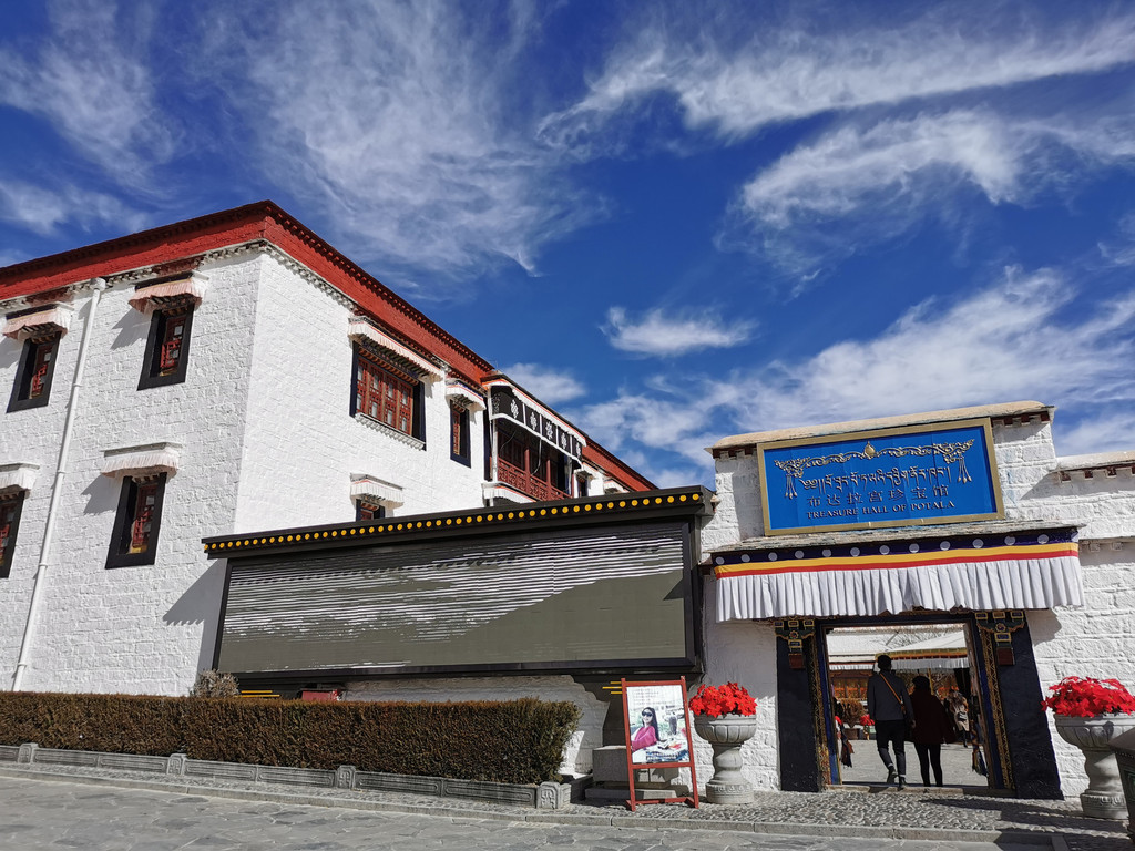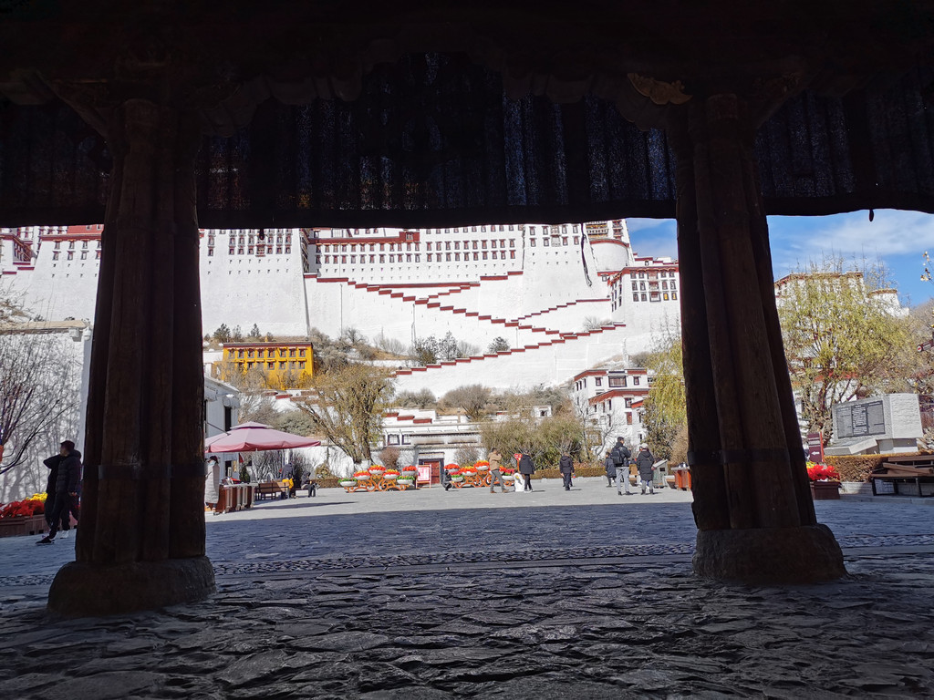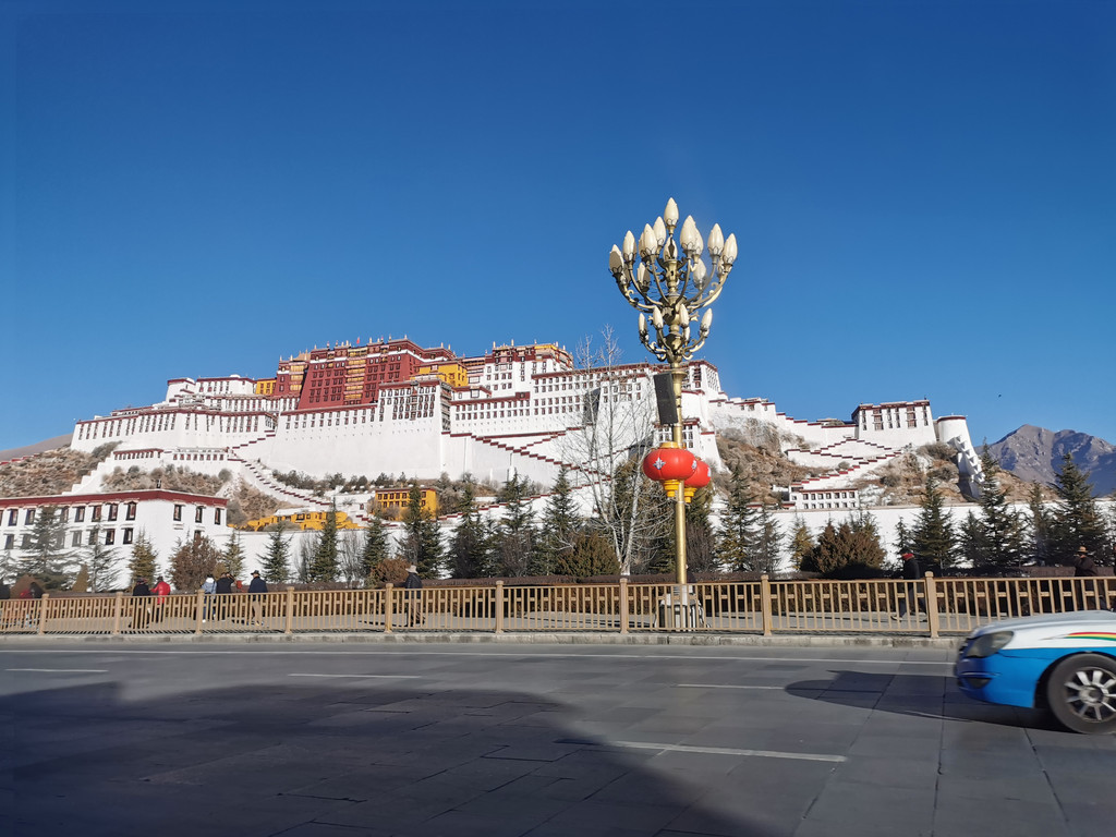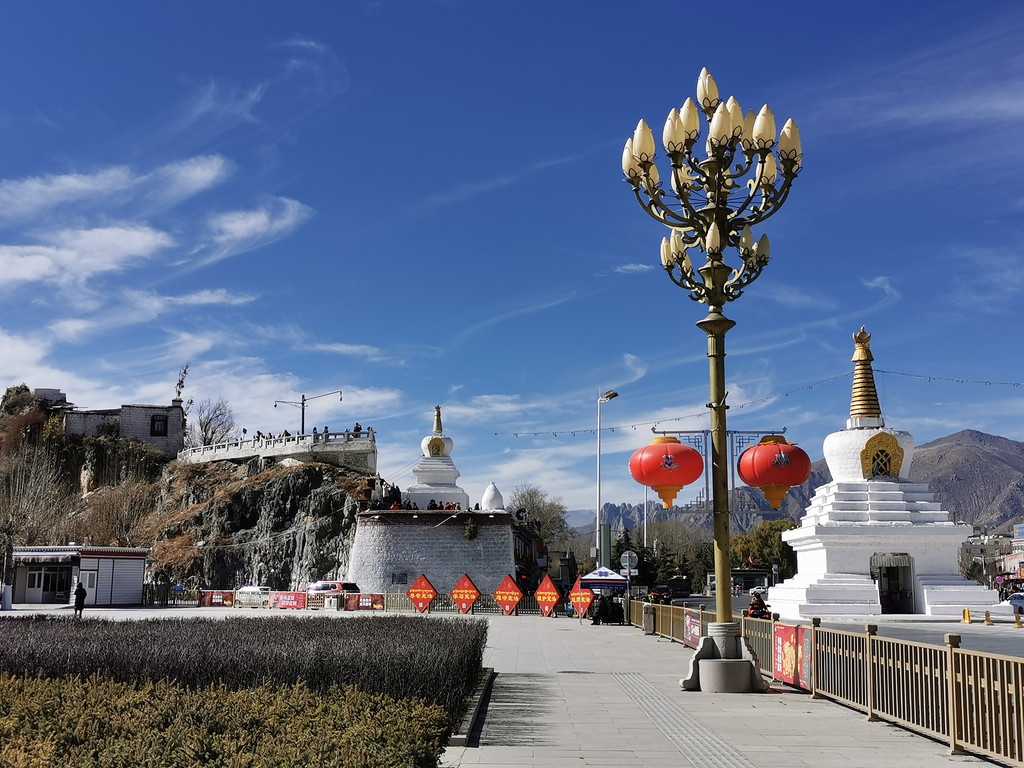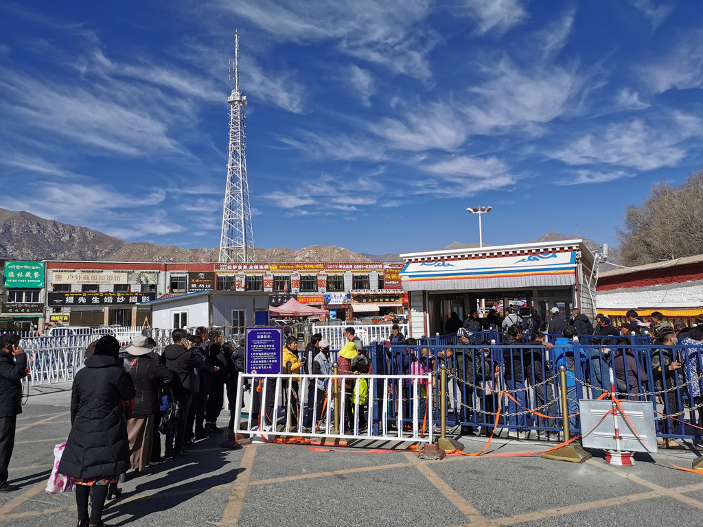 休息一个小时后外出游览。酒店楼下康昂多南路的对面就是布达拉宫广场,作为第一站。按照许多攻略中说的动作要慢、幅度要小,400米路程走了10分钟。先过安检。在西藏需要安检的地方很多,进出机场、车站、景区等公共场所,都要人脸识别、验证身份。所以身份证要随身携带。
