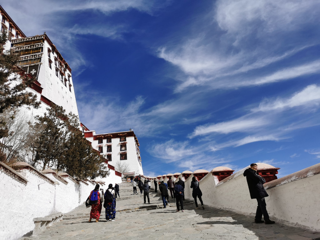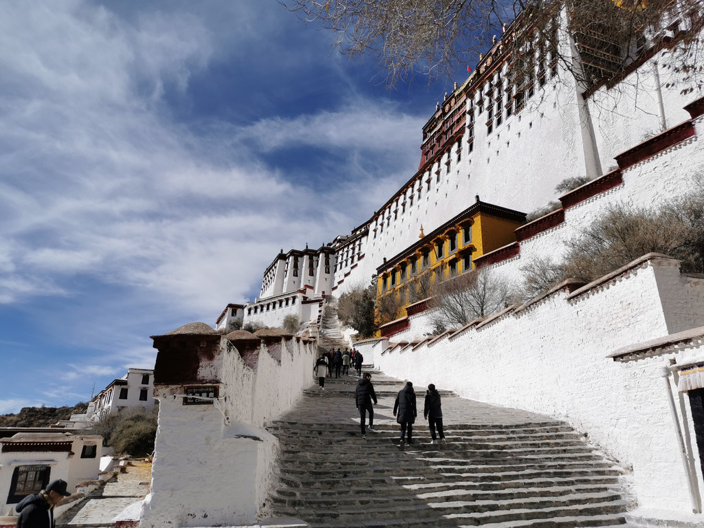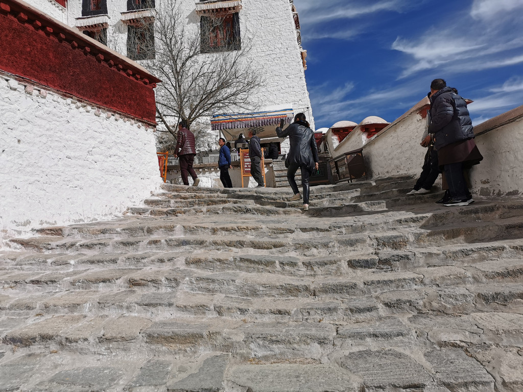 布达拉宫建在红山上,参观时要沿着“之”字形山道,一级台阶一级台阶往上爬。也许这在平原地区没有什么大不了的,但在海拔3600多米的拉萨,登爬900多级台阶是一件很费力的事。