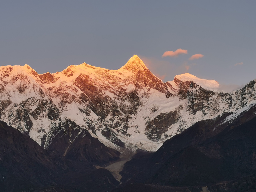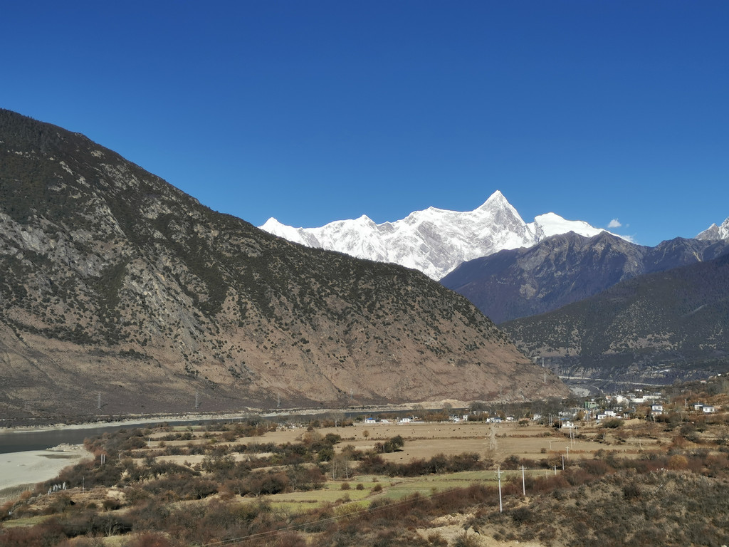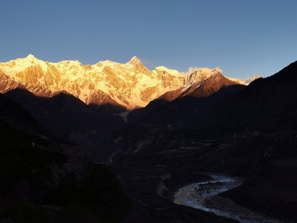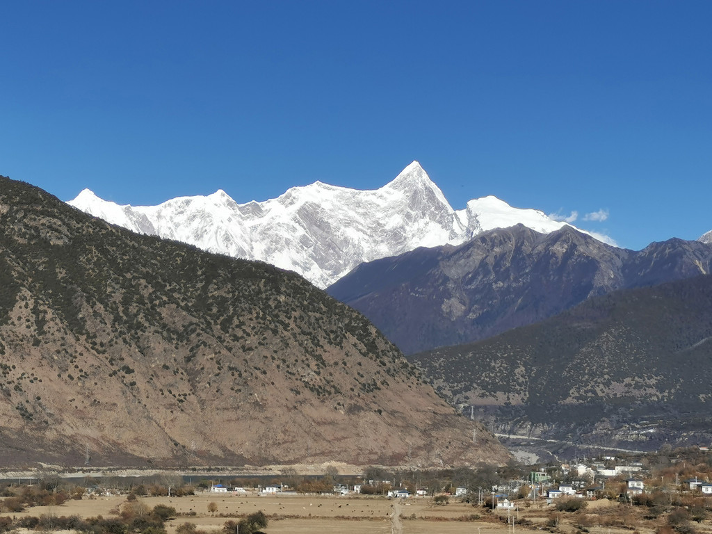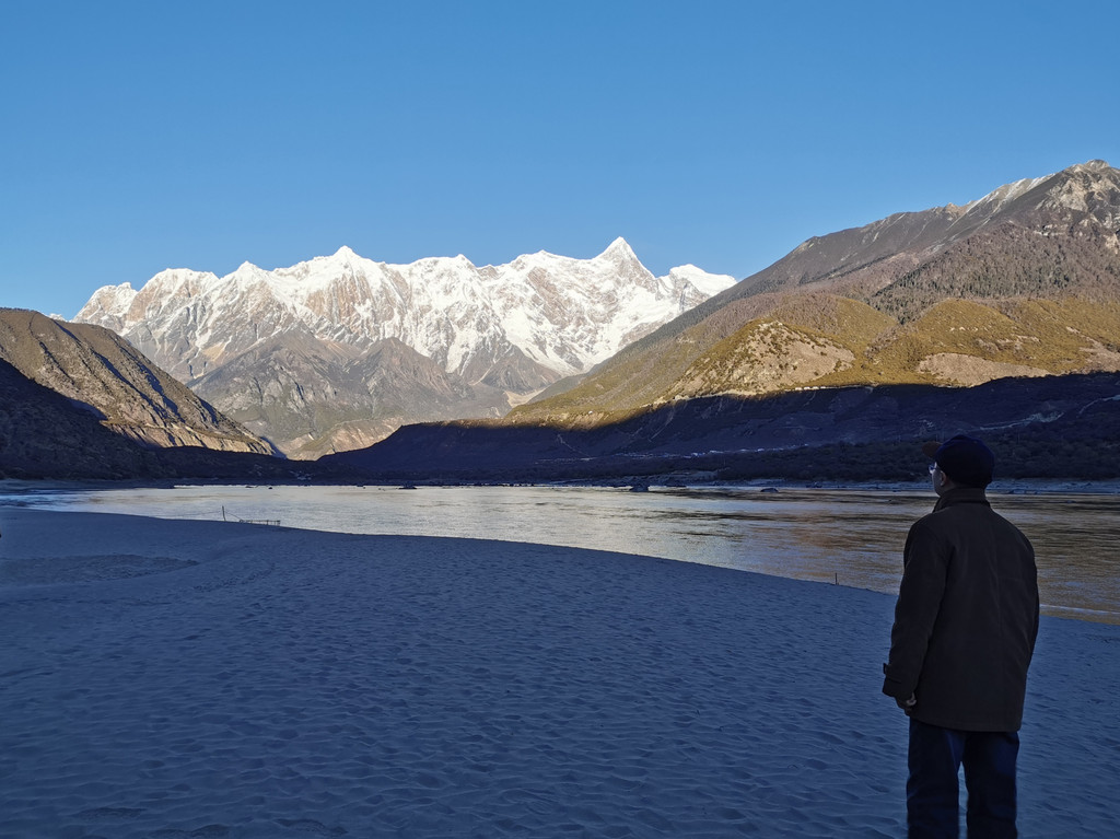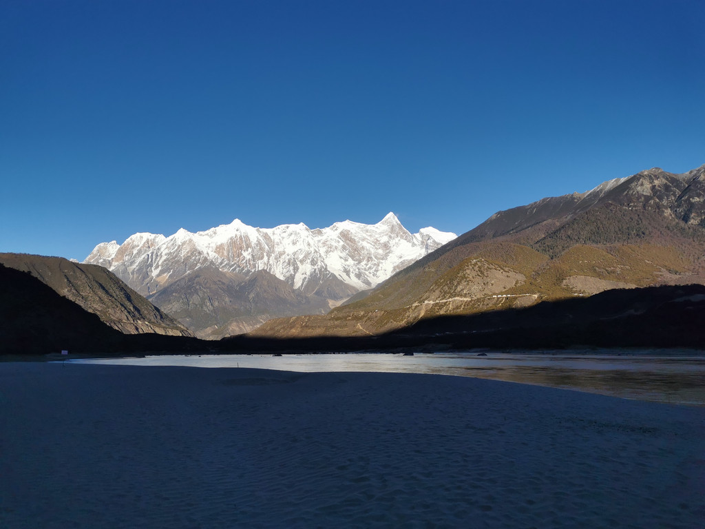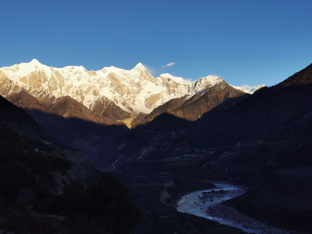 南迦巴瓦峰海拔7782米,高度排在世界最高峰第15位,前面14座高山全是8000米以上的山峰,因此她是7000米级的最高峰。观赏南迦巴瓦峰最重要的是季节,雨季经常云雾缭绕,10月下旬到次年1月看到全貌的概率非常大。这次很幸运,近距离观赏了白雪皑皑的庄严神山和梦寐以求的日照金山。
