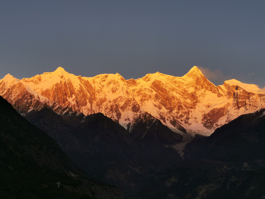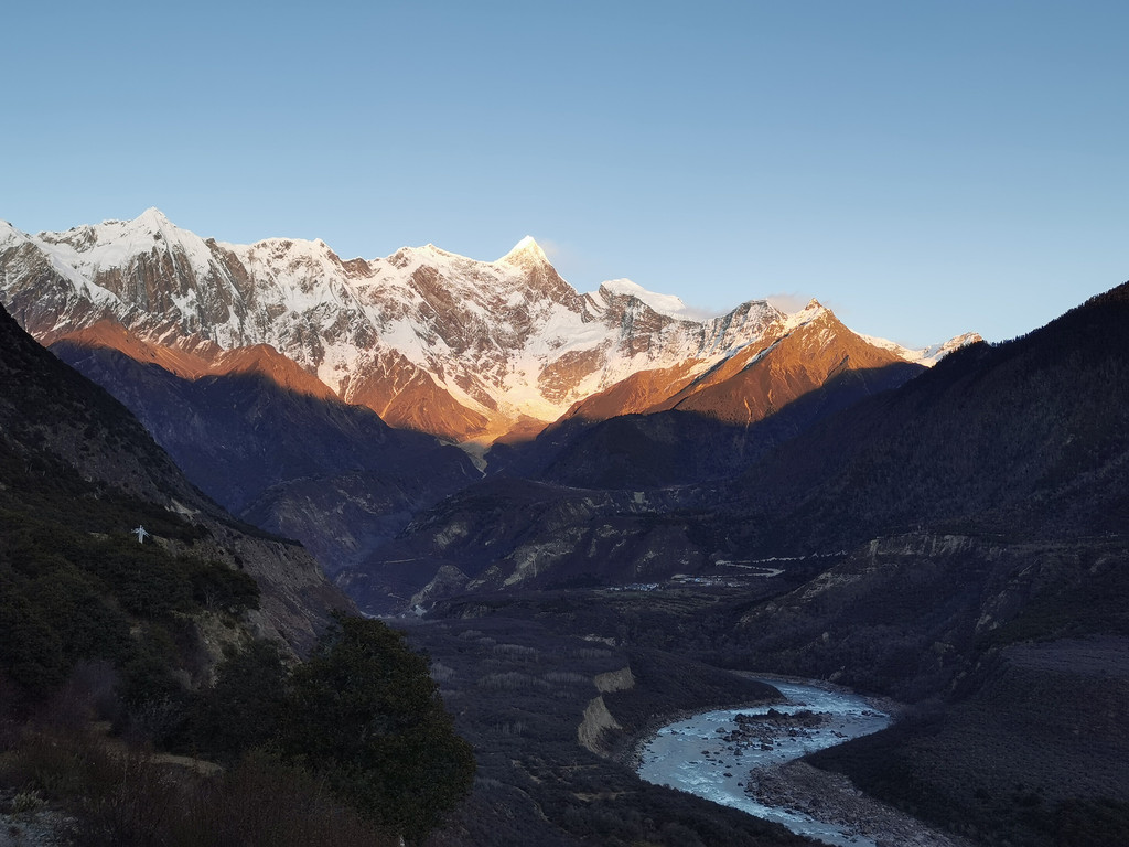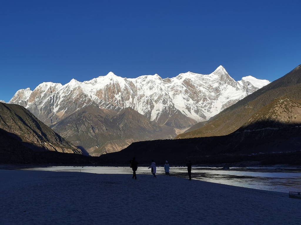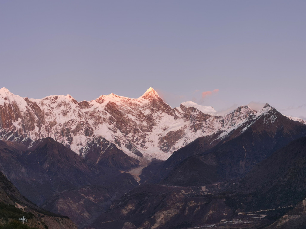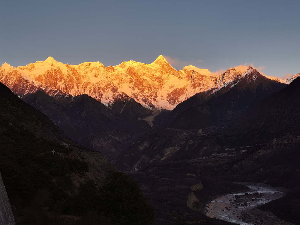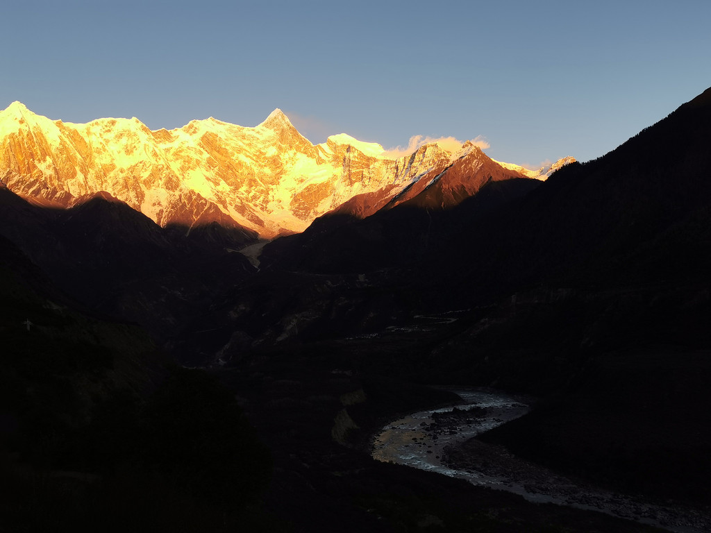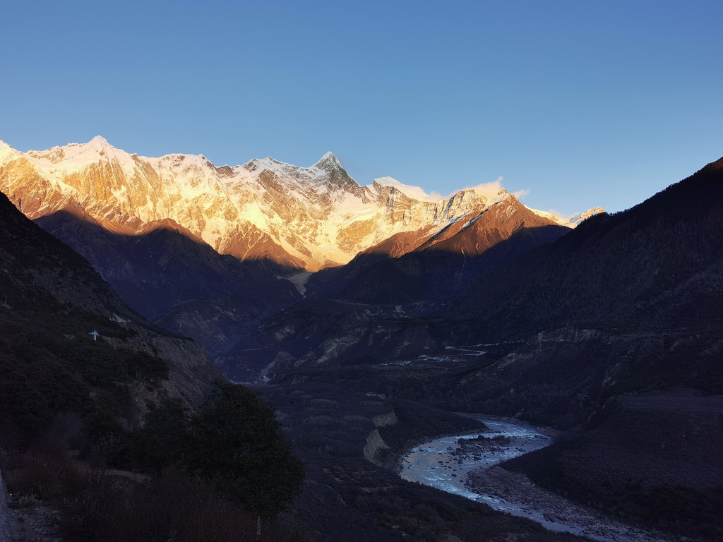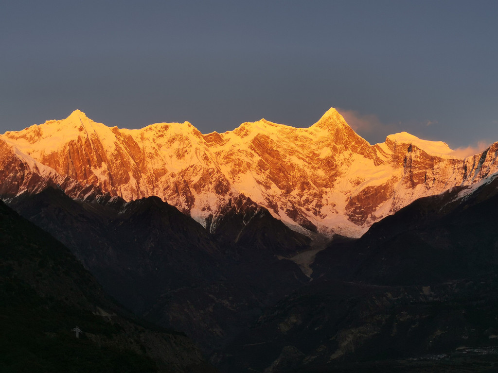 南迦巴瓦峰海拔7782米,高度排在世界最高峰第15位,前面14座高山全是8000米以上的山峰,因此她是7000米级的最高峰。观赏南迦巴瓦峰最重要的是季节,雨季经常云雾缭绕,10月下旬到次年1月看到全貌的概率非常大。这次很幸运,近距离观赏了白雪皑皑的庄严神山和梦寐以求的日照金山。