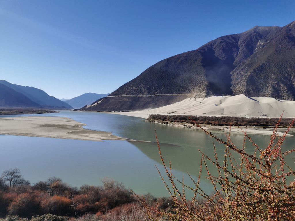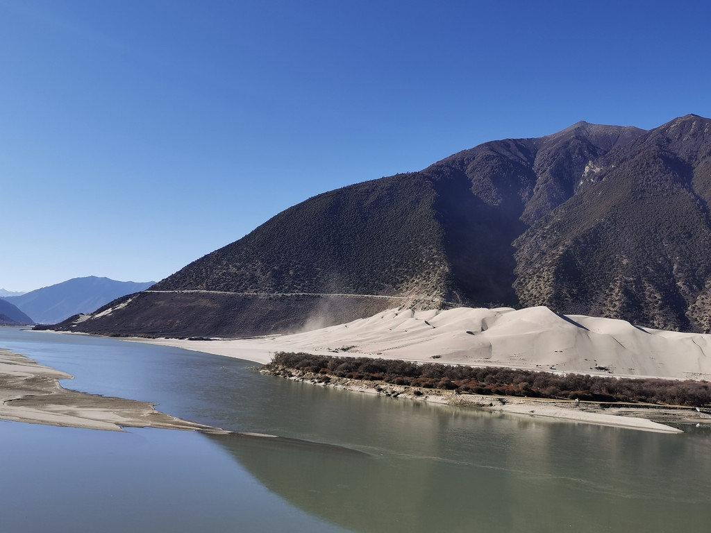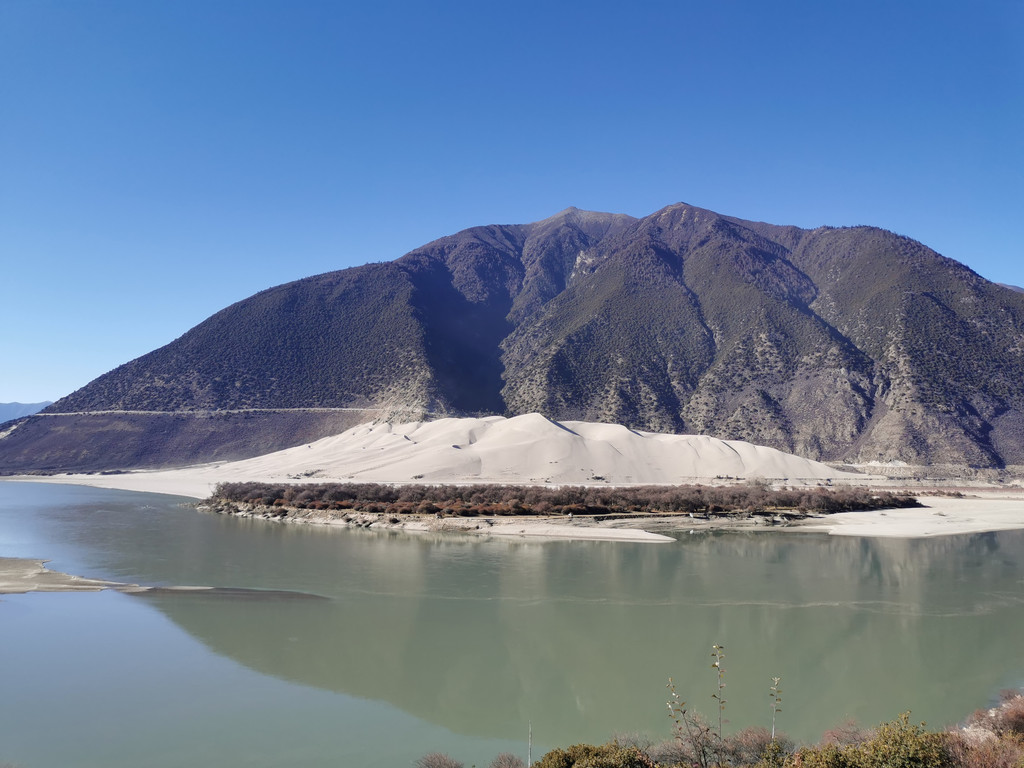 沙丘位于米林县丹娘乡雅鲁藏布江北岸的强风口地段。每年秋天至春末的枯水期,河床上露出的河沙被飓风吹送堆积至此。年复一年,形成了这一独特的地貌景观。