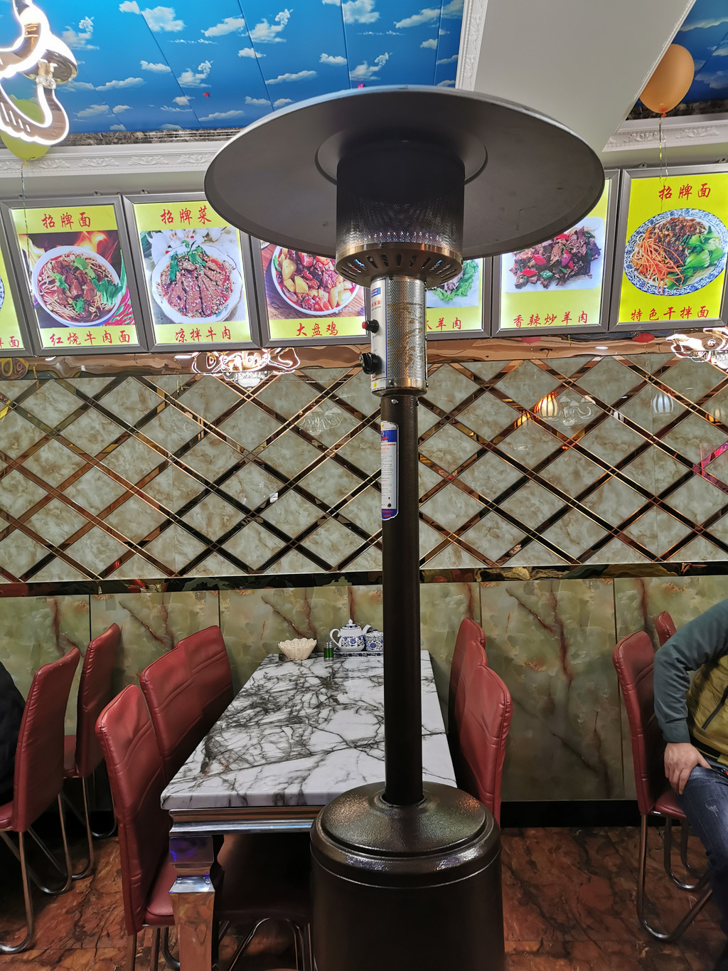 伞形燃气取暖器,很多店里有这种取暖设备,应对太阳落山后的寒冷。