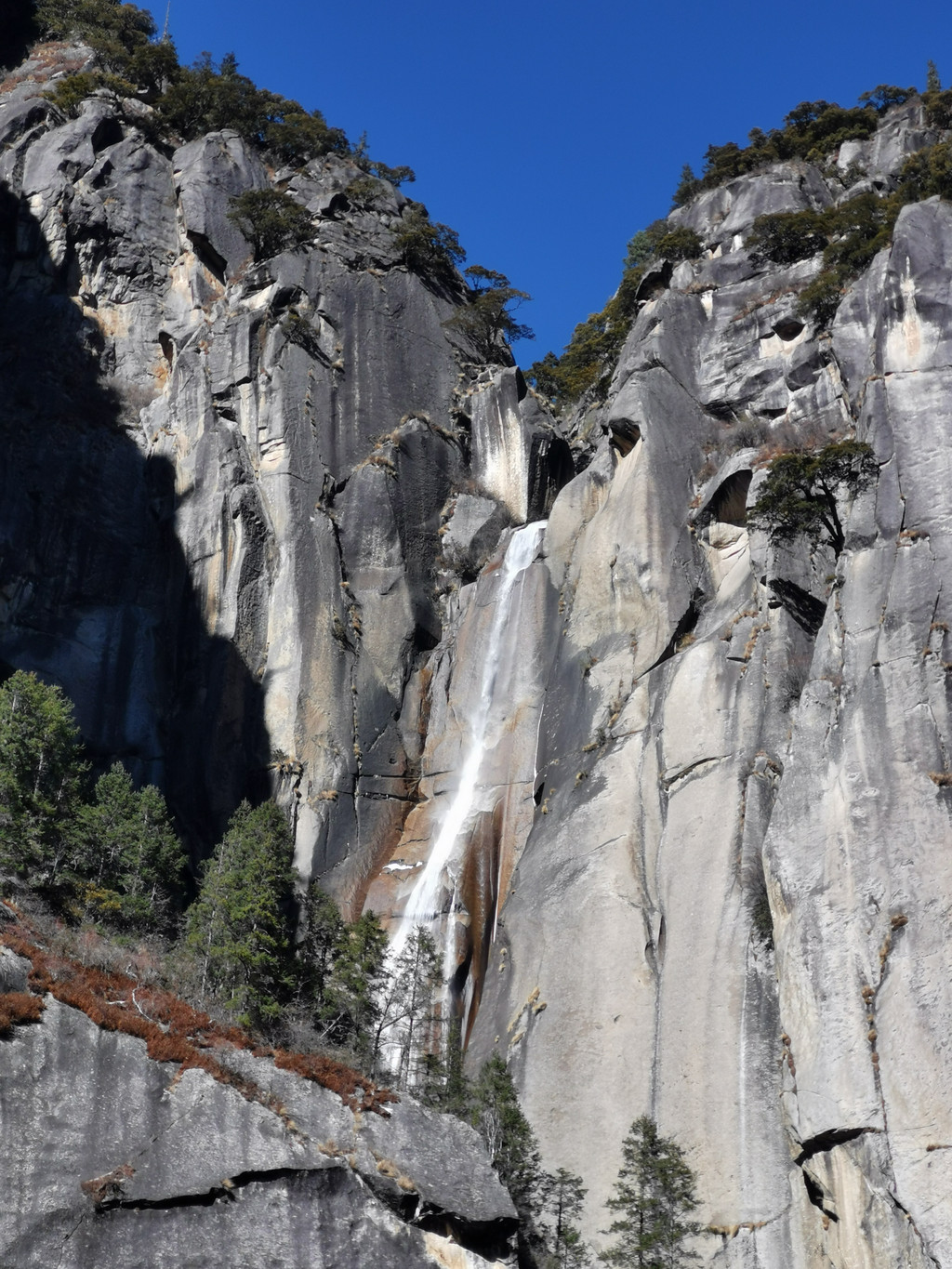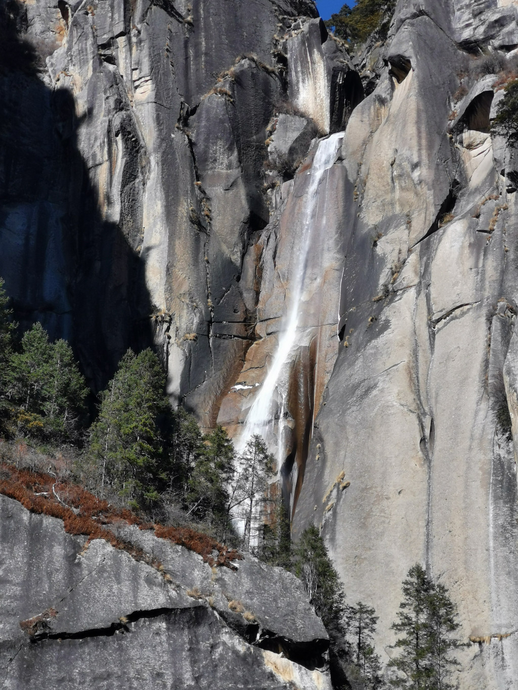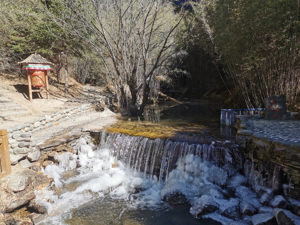 瀑布落差约200米,冬季雨水较少,看不出多少气势。之所以称为天佛瀑布,是瀑布中间偏左有一个人脸一样的强巴佛像。大家左看右看,加上旁边有个人指点,觉得是有点像。