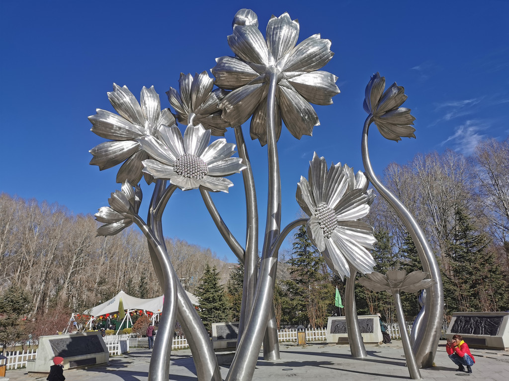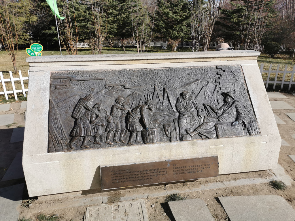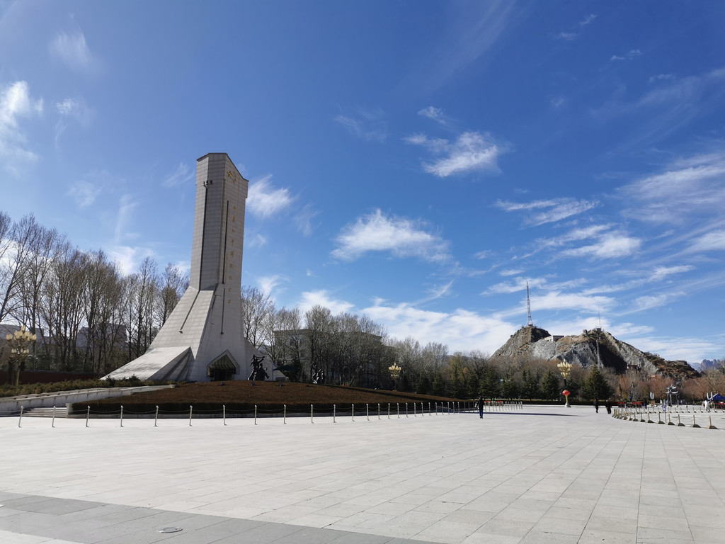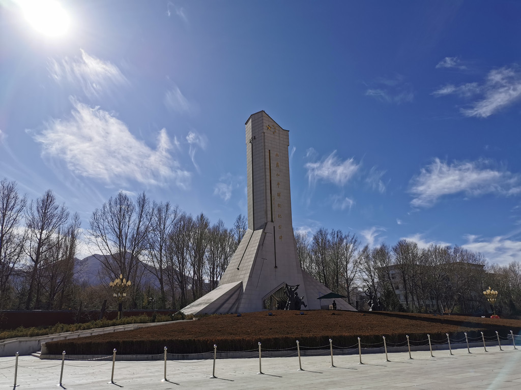 西藏和平解放纪念碑,建于2001年,纪念1951年西藏和平解放50周年。主体呈灰白色,以抽象化的珠穆朗玛峰为造型,顶部是国旗五星图案,下方是翻身农奴得解放、解放军筑路赞为主题的两组青铜雕塑。