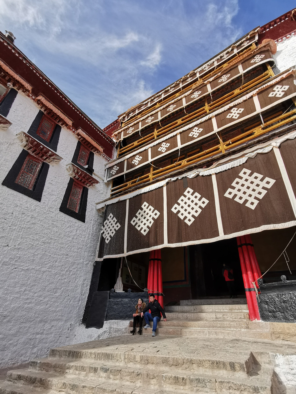 “德阳夏”东欢乐广场,专供DaLai喇嘛在节日期间观赏跳神、藏戏表演的场所。上面三排并列的木质扶梯,虽然不是很高,但比较陡。中间的扶梯DaLai专用,僧众和官员只允许从两边的扶梯上下。这里是到各个宫殿的必经之路,再往前就开始参观白宫,里面和外面都不允许拍照了。