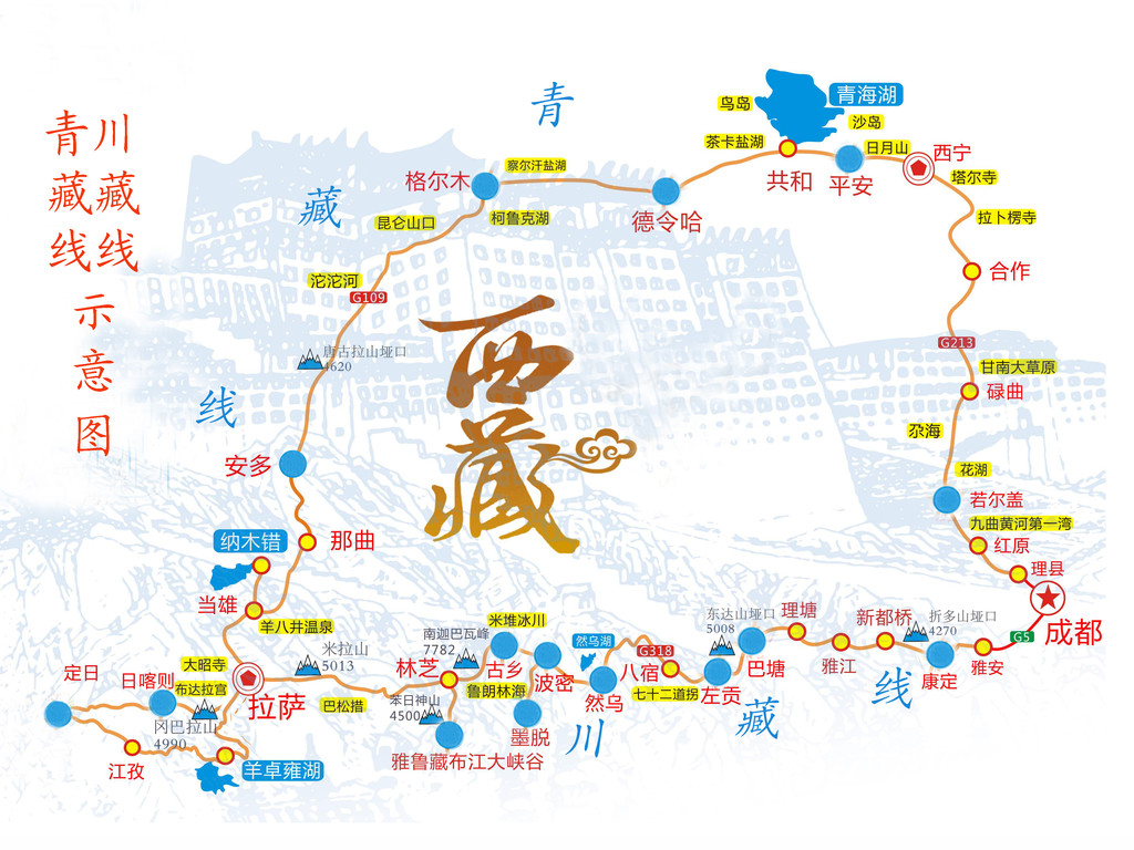 川藏公路东起四川成都,西止西藏拉萨。1950年动工,1969年通车。由318国道、317国道、214国道、109国道部分路段组成,是我国最险峻的公路。分为南北线,南线长2115公里,北线长2414公里。青藏公路东起青海西宁,西止西藏拉萨。1950年动工,1954年通车。全长1937千米,全线平均海拔在4000米以上。青藏川藏公路展现了高原筑路人不怕苦不怕死,不畏艰难险阻,不惧流血流汗的“两路”精神和“老西藏精神”,是激励后人继续奋斗的宝贵财富。