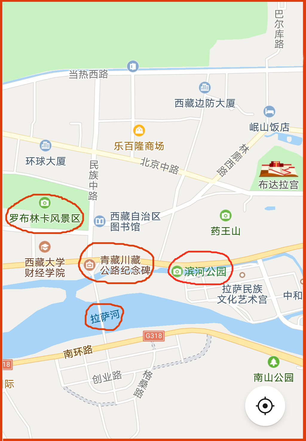 今天返程航班是中午12:50,还可以在拉萨市区逗留一段时间,安排了拉萨河水利风景区、青藏川藏公路纪念碑、罗布林卡几个靠在一起的景点。罗布林卡9:30才开门,所以先去拉萨河沿岸。