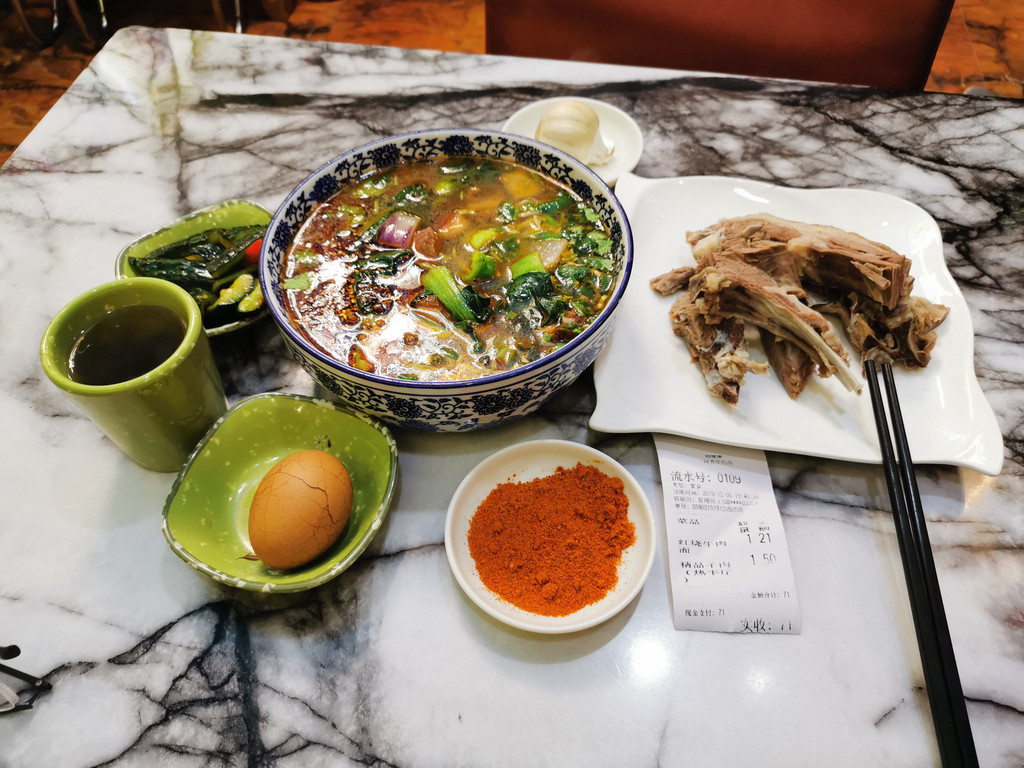 兰州牛肉面(21元)、手抓羊肉(半斤,50元)。这里蔬菜相对贵一点。