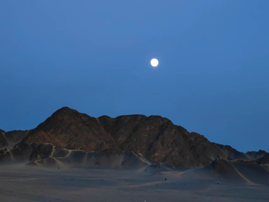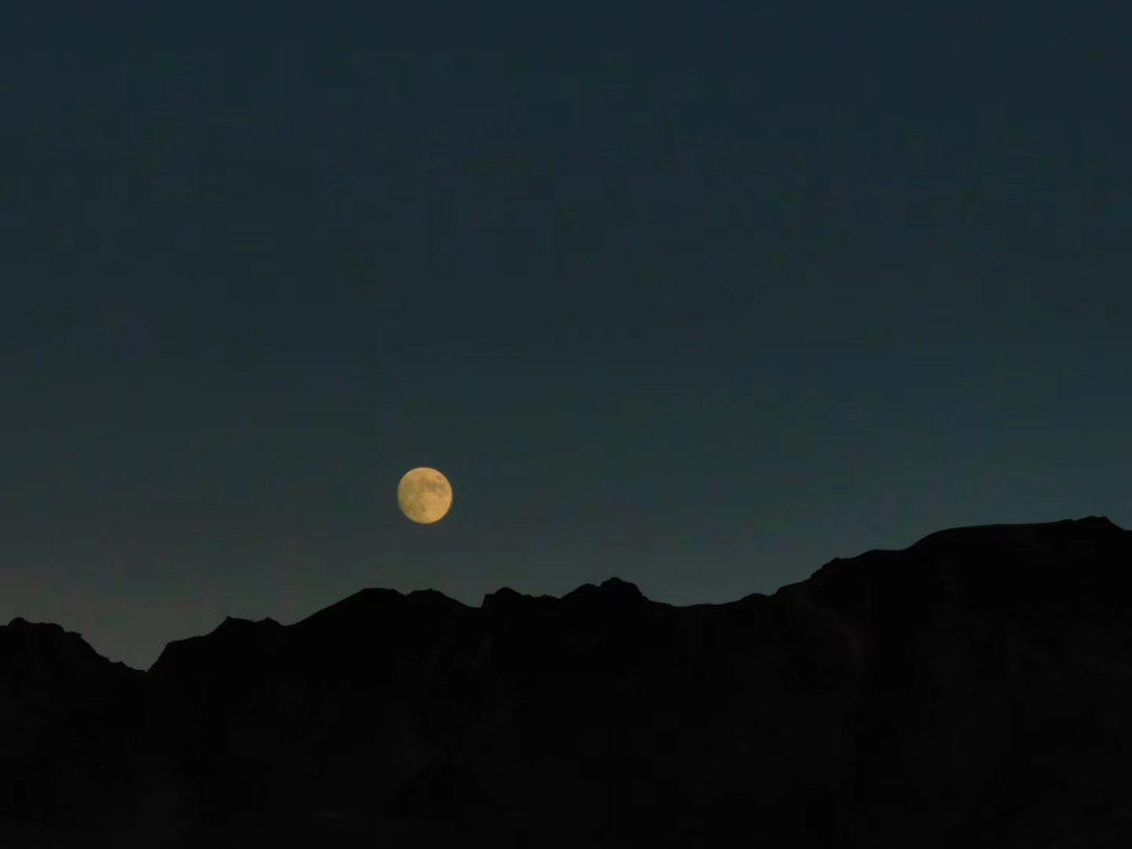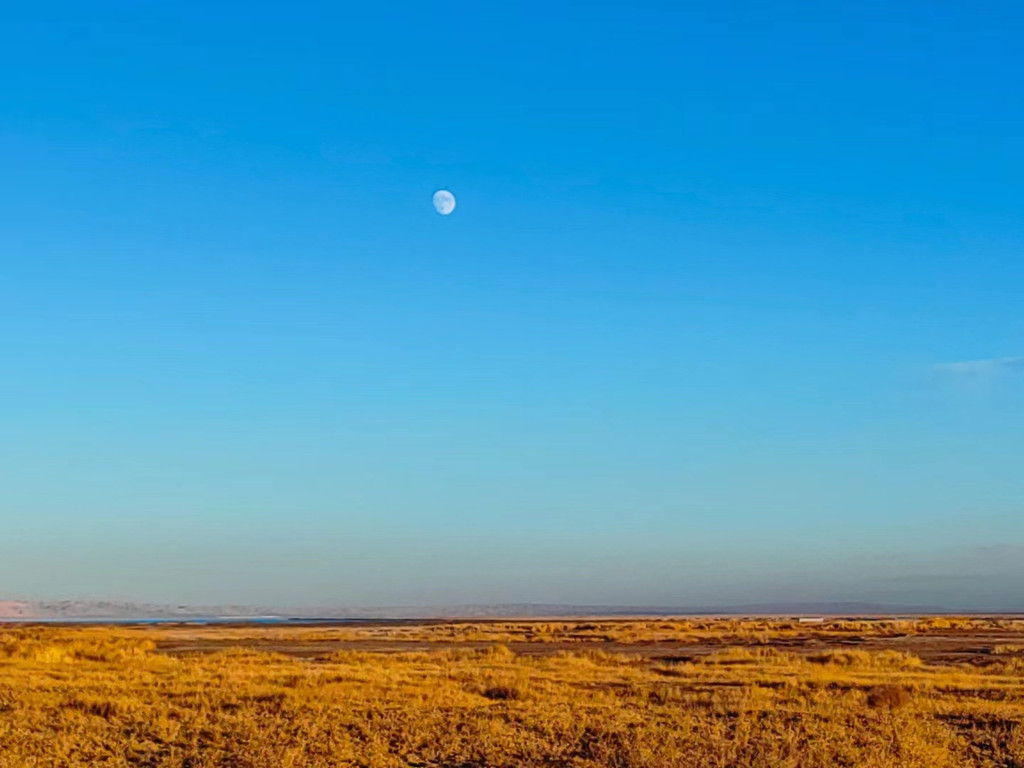 若羌县到茫崖市艾肯泉有约380公里,驾车5个多小时后到达已是傍晚5时多,下车时已被缓缓升起的浩月所激动,月亮很大也很亮,悬挂在海蓝色的天空中,在金黄色草地的衬托下,特别的空旷深邃。所幸昨晚狂奔4个多小时到达若羌,要不今天的行程就拖迟延误,看不到阿尔金山无人区的日月同框,相互辉映。