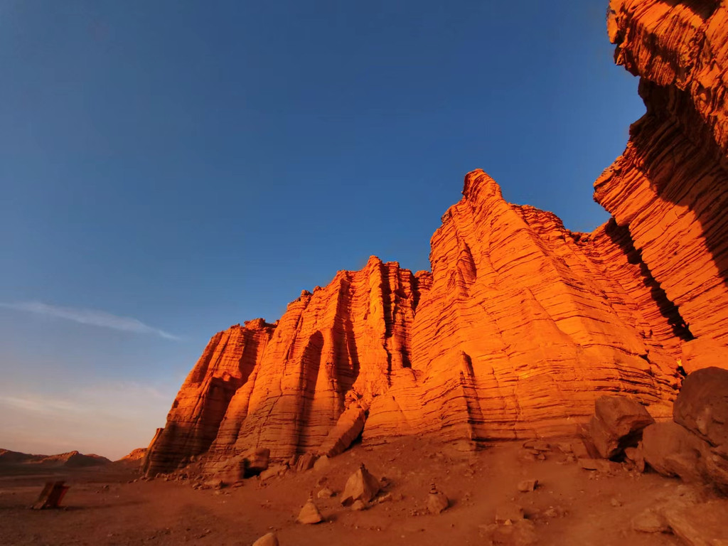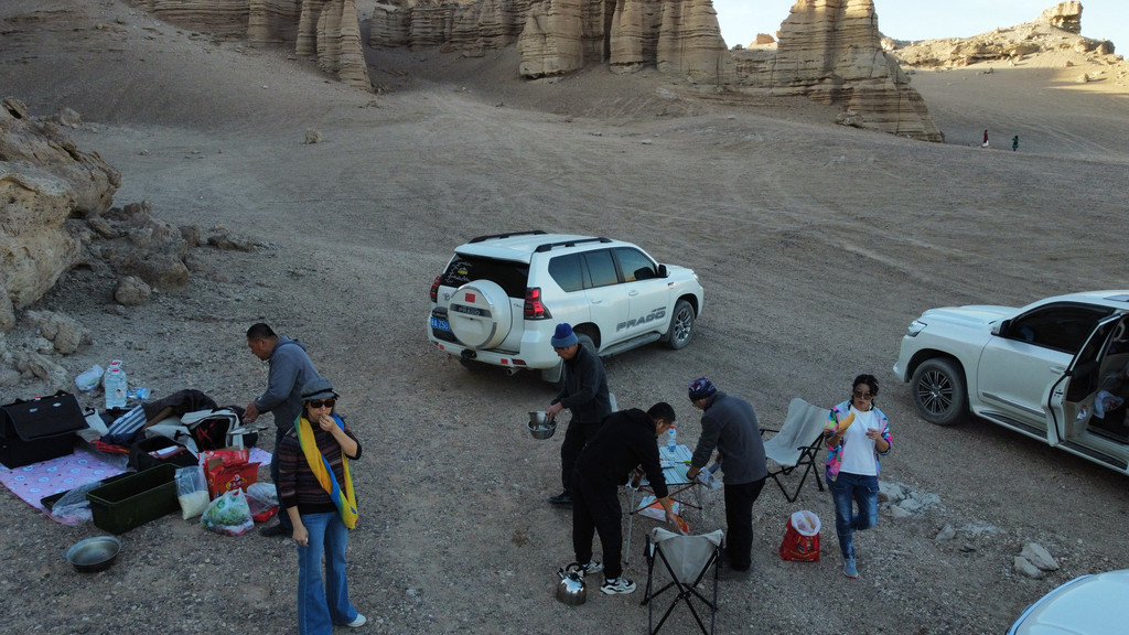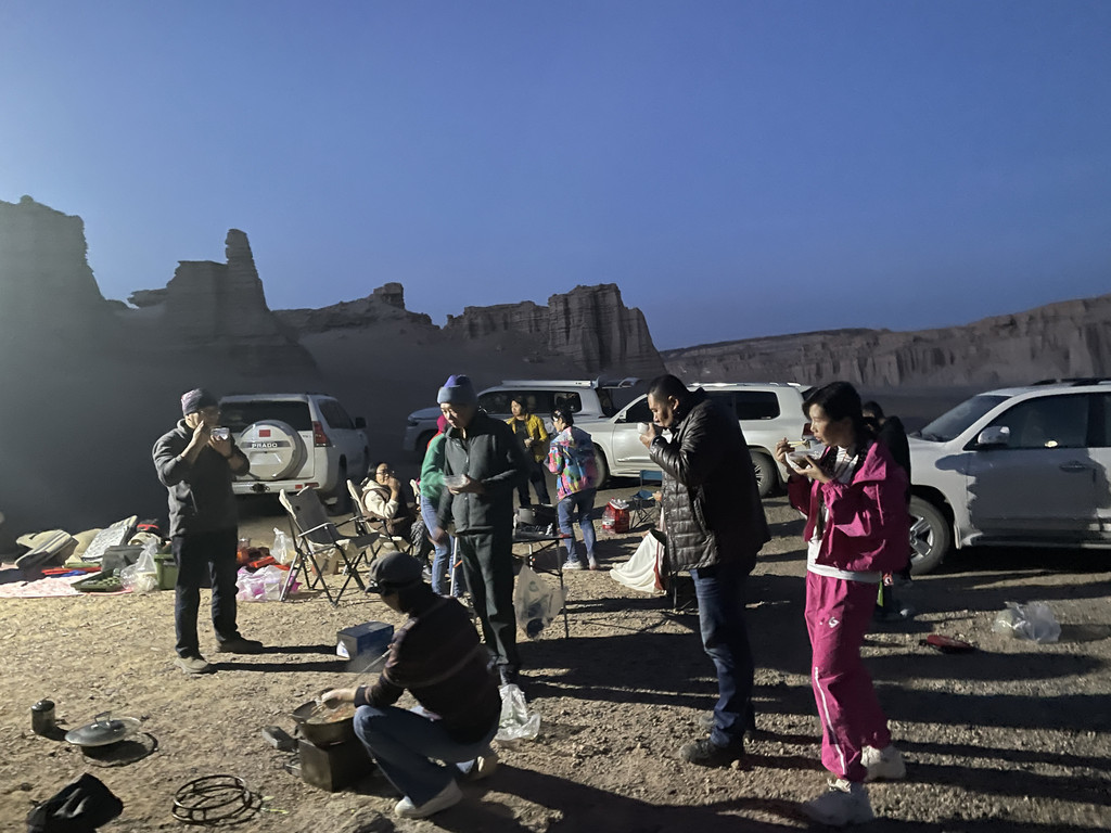 在景区内通天洞对面的地方,小伙伴搭起了露营的工具,煮茶、开炉烧饭,唱歌跳舞,浸醉于壮丽的雅丹美景和旅途的欢乐之中。