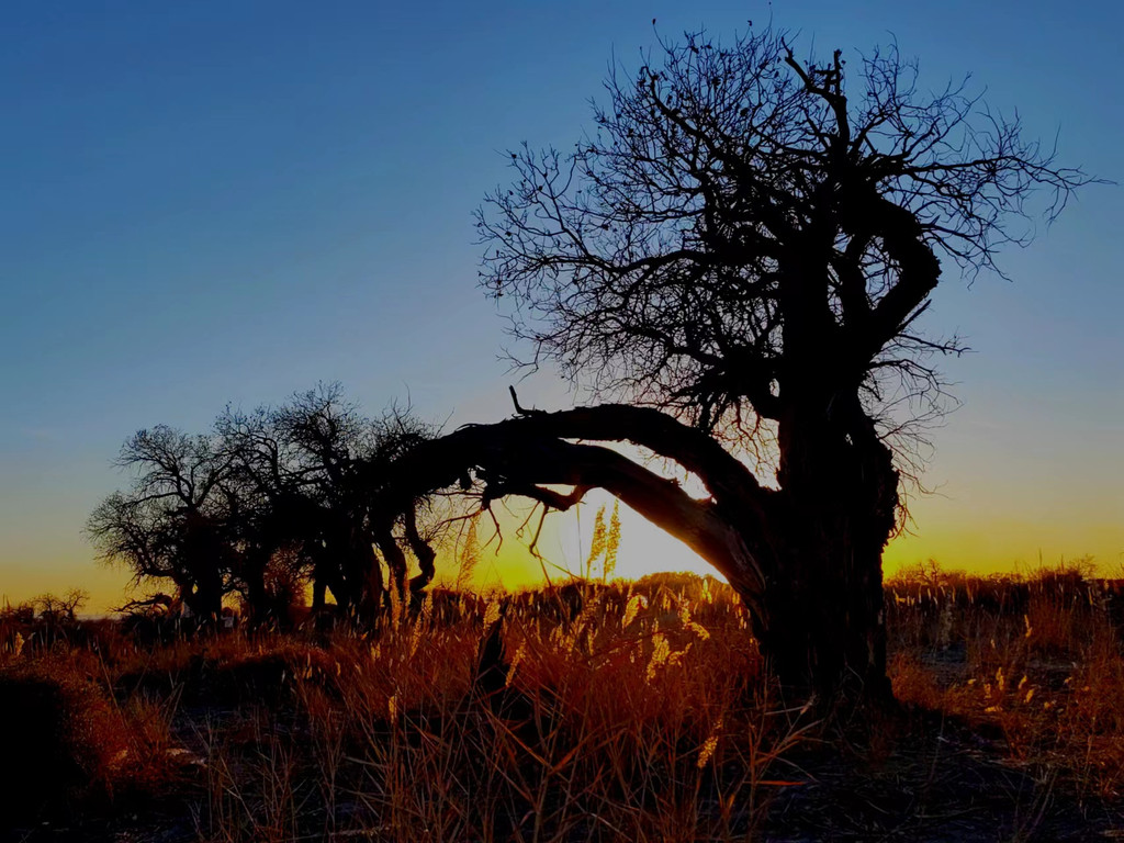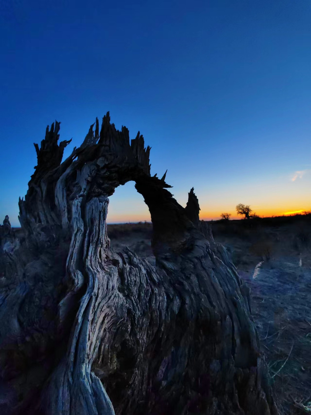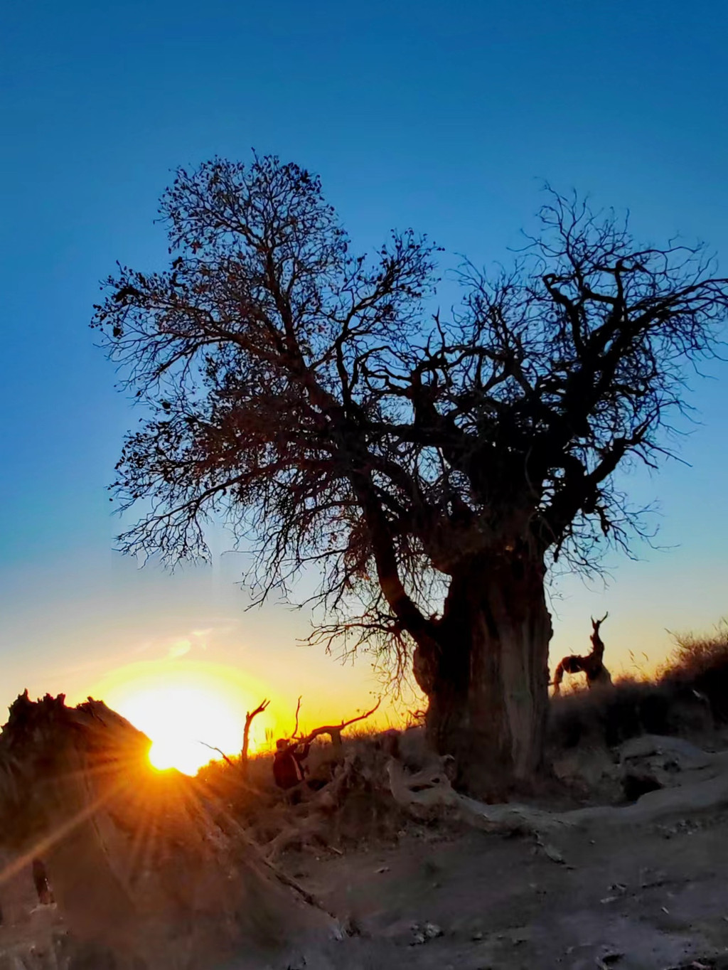 到达木垒胡杨林景区已是傍晚5时多,此时的胡杨,经过前几天雨雪的洗礼,已经脱去了金黄华丽的外衣,露出了健硕的躯干,充满着饱经风霜的岁月痕迹。在余晖的照射下,披着金衣,矗立在茫茫戈壁滩中,护守着这片沧凉荒芜的大地。