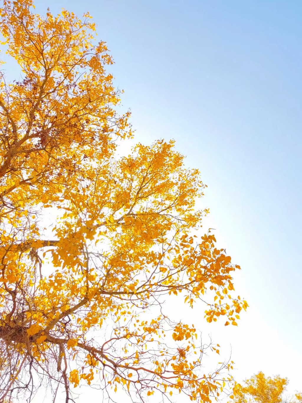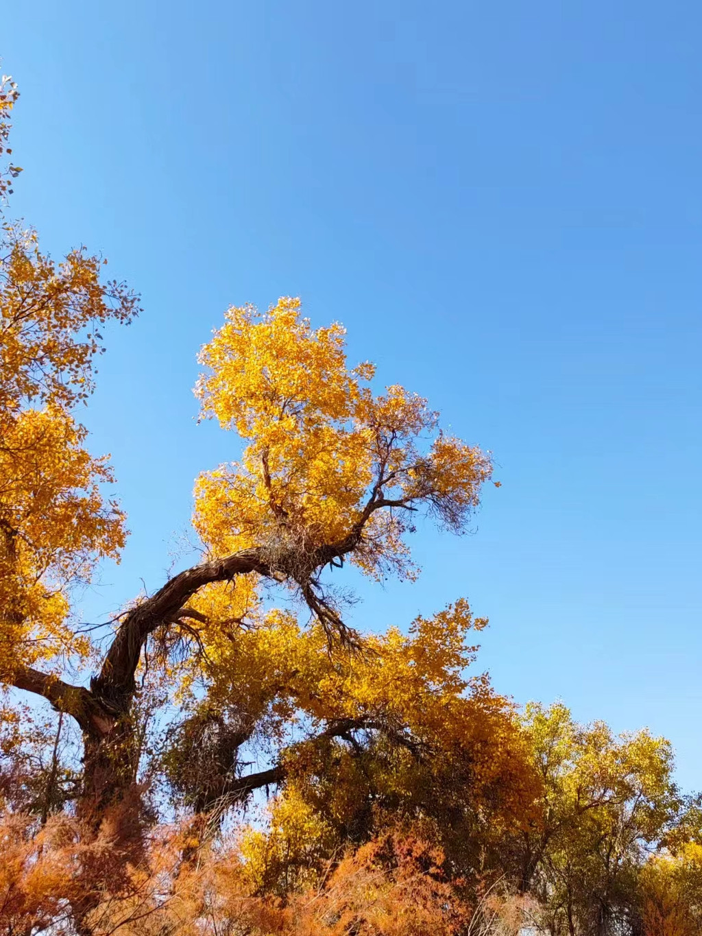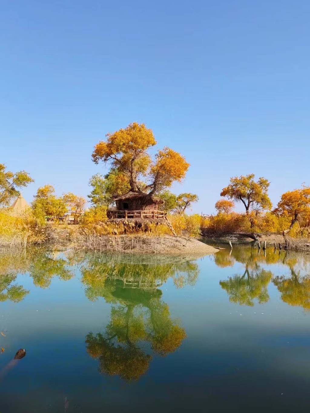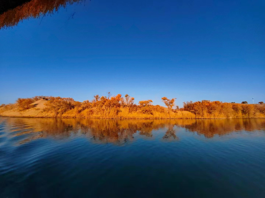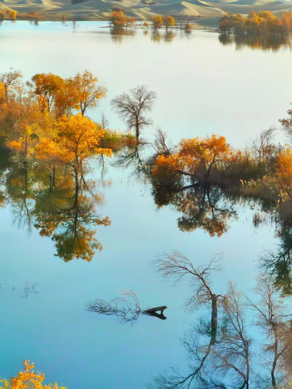 葫芦岛因其水域像个葫芦而得名,这里沙漠与水、胡杨共存,是浑然天成深藏大漠的一颗金色明珠。葫芦岛的胡杨、湖泊 大漠共存,三者浑然天成。深秋已至,胡杨树全被染黄,在湛蓝的天空下,呈现出一片婉转、柔美、明媚,宛如大漠中的桃源仙境。