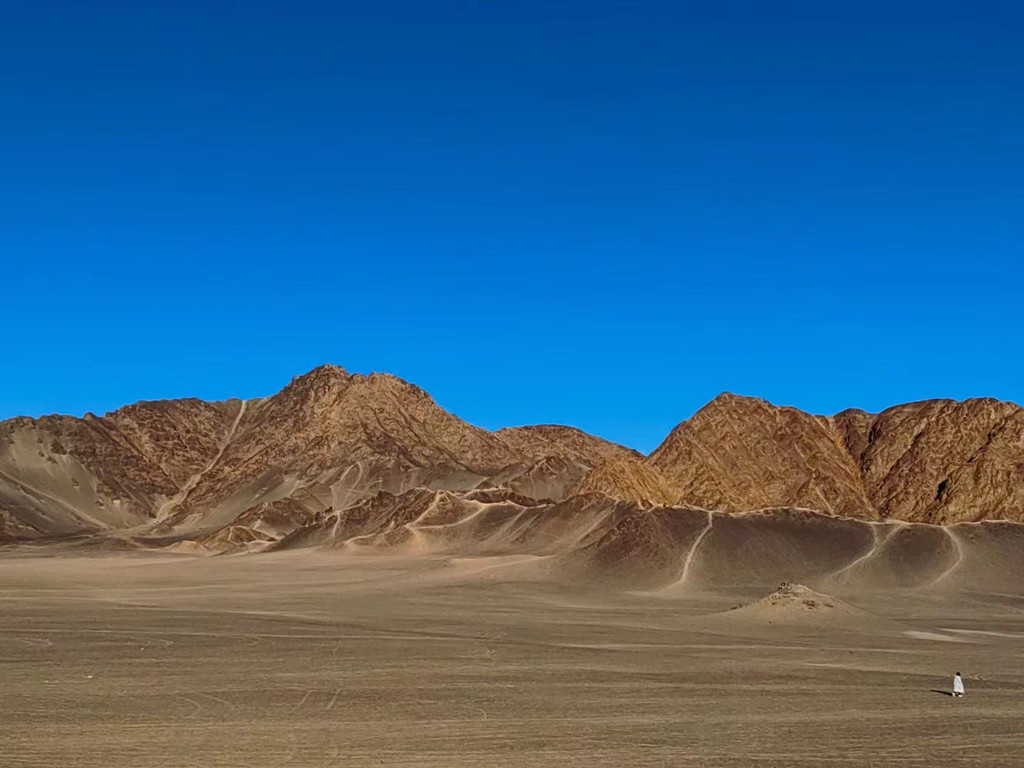 从早上9时出发,经过6-7小时马不停蹄的车程,约中午4点到达了大海道,茫茫戈壁,沧凉、荒芜,让人一眼千年,看尽沦海桑田变化。驱车在沙石路上时,飞扬起了浓浓的沙尘,决尘于荒凉戈壁中,颠簸着每个在车上的伙伴,狂野不羁、自由放飞的感觉油然而生。