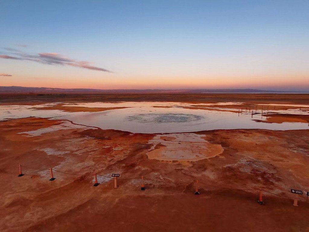艾肯泉是喷涌千年的地热喷泉,直径10多米,绿色的泉水,如同沸腾的开水,泉水里的矿物质在土地上沉淀出深红环带状的“天眼边界”。从空中俯瞰,泉眼与喷涌而出的泉水组成了“大地瞳孔”的造型,脉络清晰,栩栩如生。