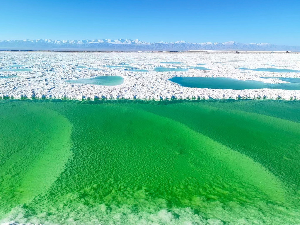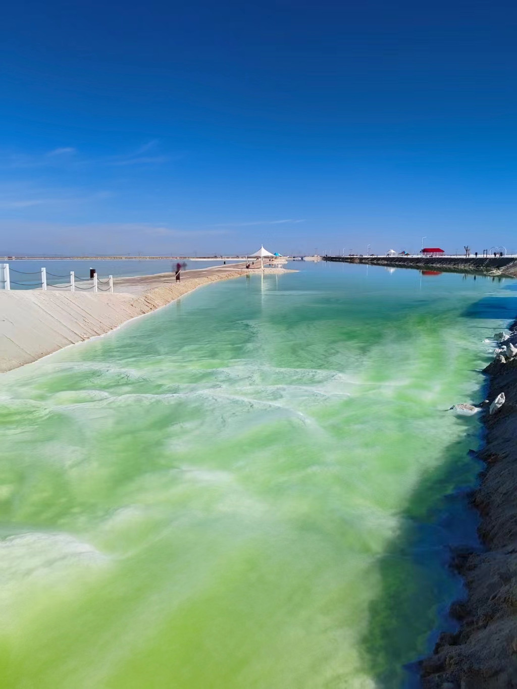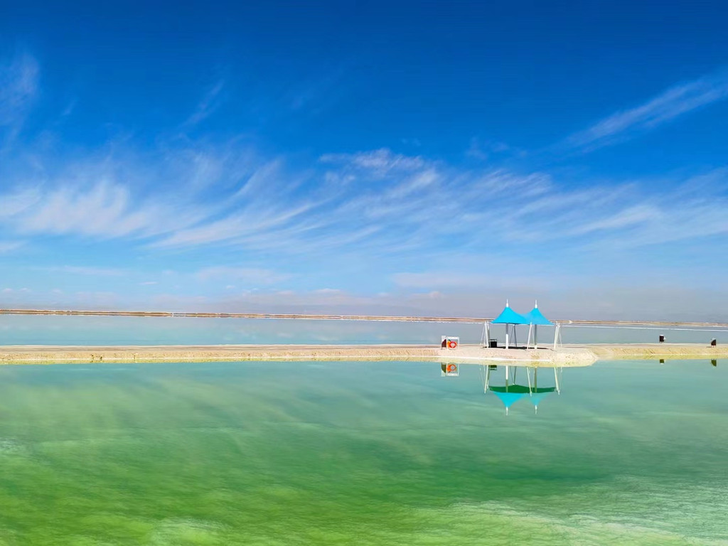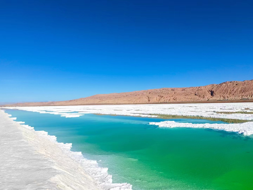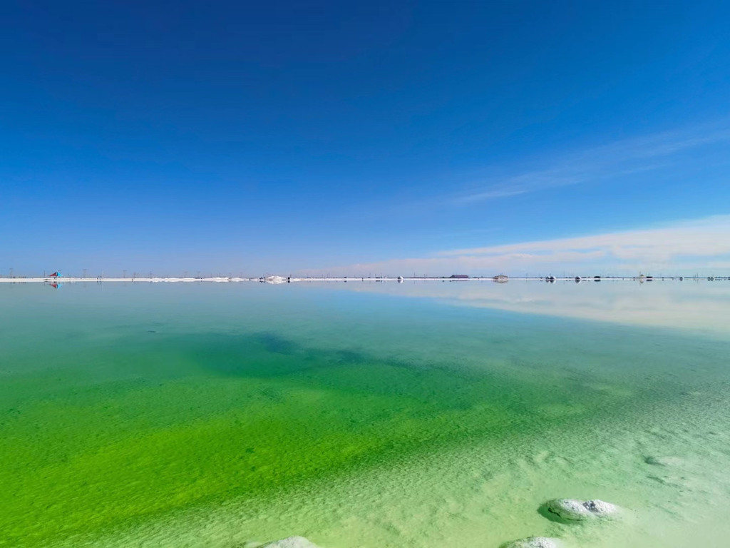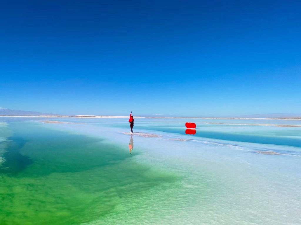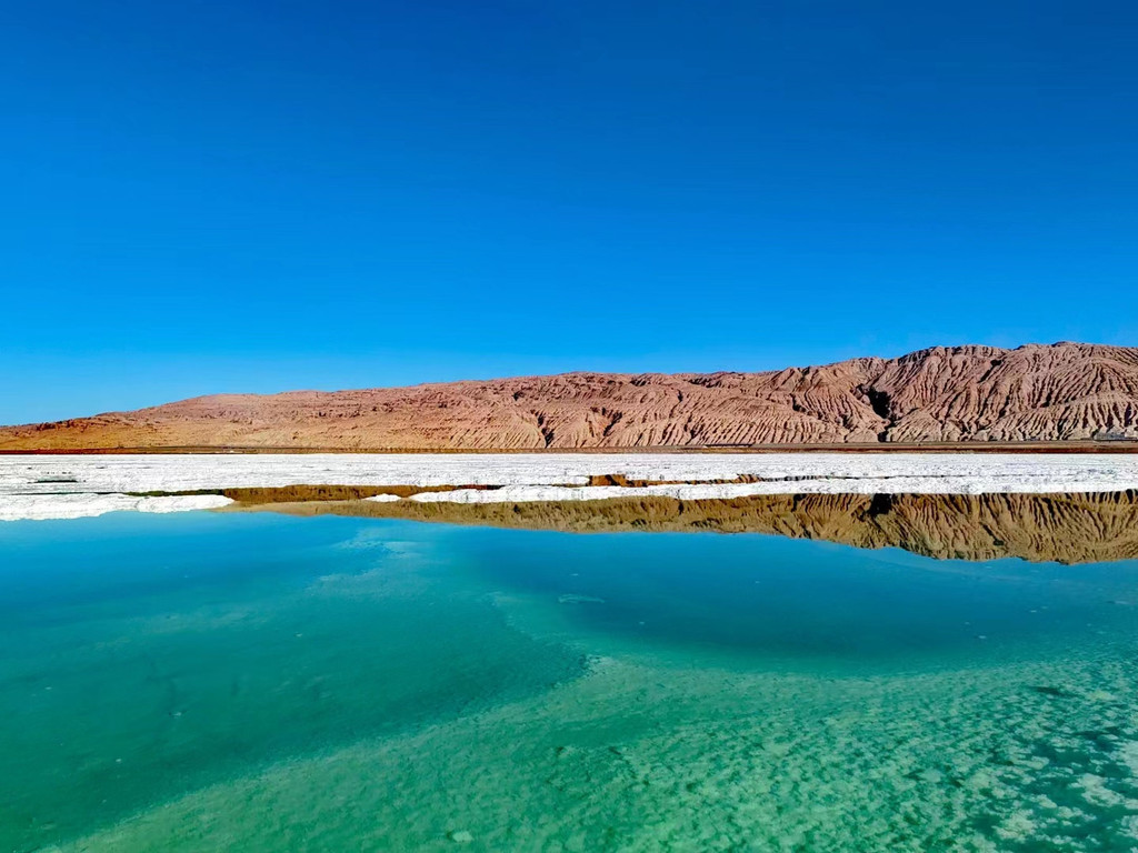 进入青海茫崖就进入了西西可里无人区的边沿,翡翠湖南依昆仑山,北靠阿尔金山,属于硫酸镁亚型盐湖。湖水如镜,映照着远处高山白雪,蔚蓝天空,从深蓝到浅蓝,再从浅绿到深绿,融合得天衣无缝,浑然天成。