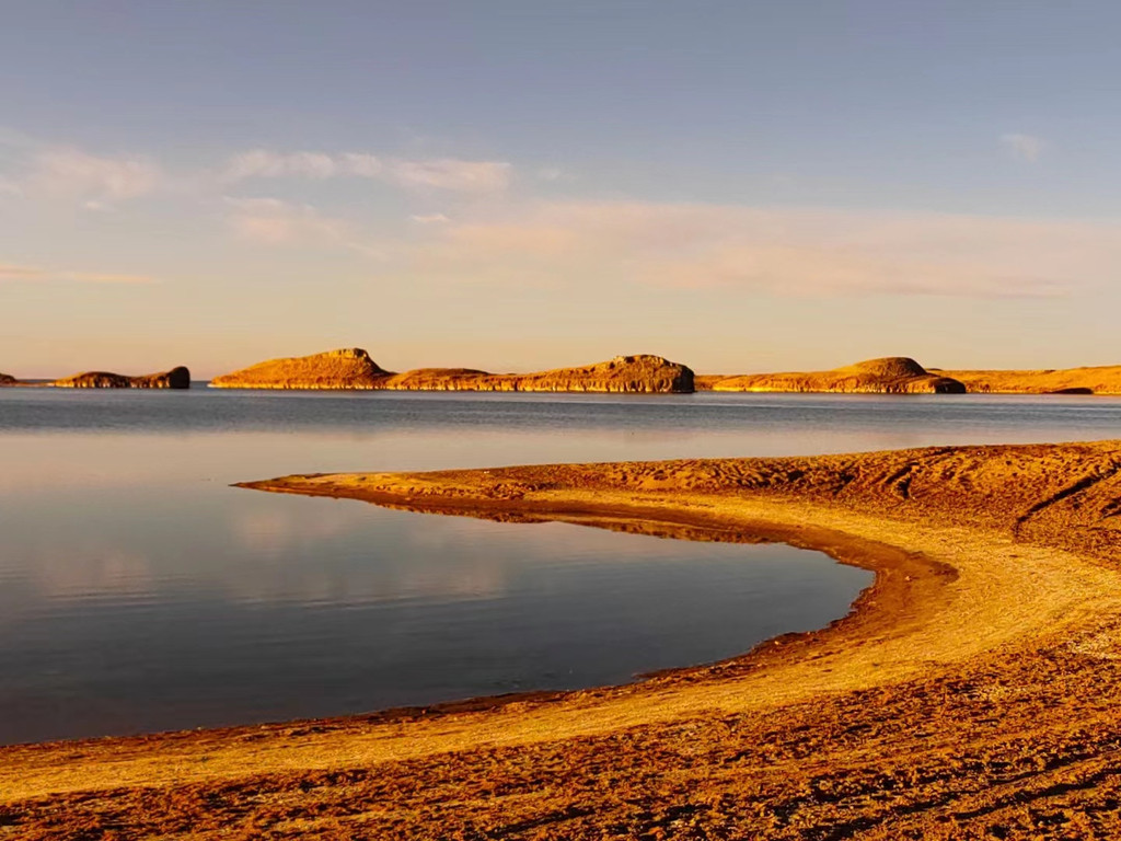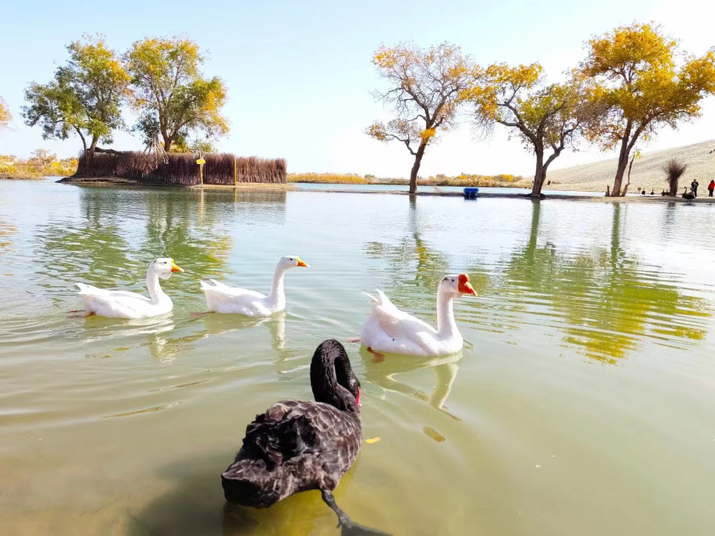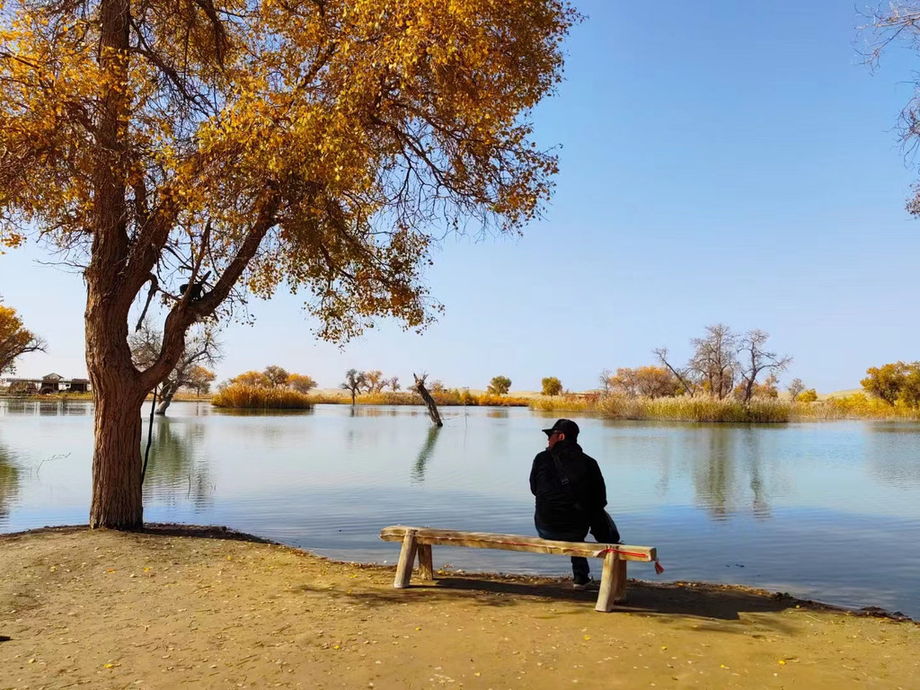 下午4:00左右到达景区后,小伙伴们和其他游客一同乘坐游船前往葫芦岛核心区,领略与木垒、塔里木胡杨不一样的美。夕阳西下,余晖残阳,也给葫芦岛的沙漠、胡杨、湖面都披上金粉,美不胜收。