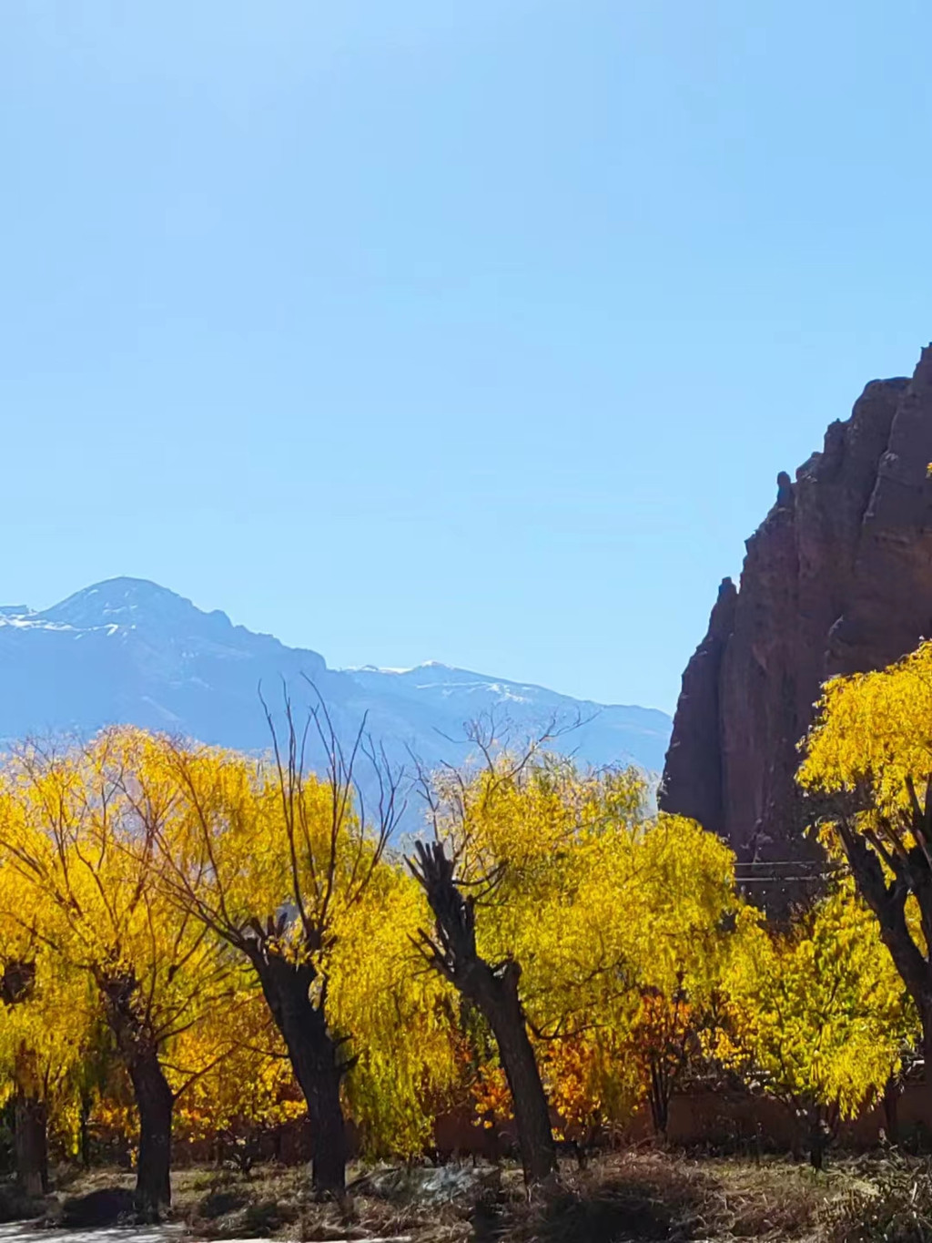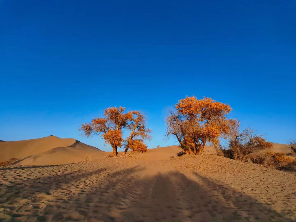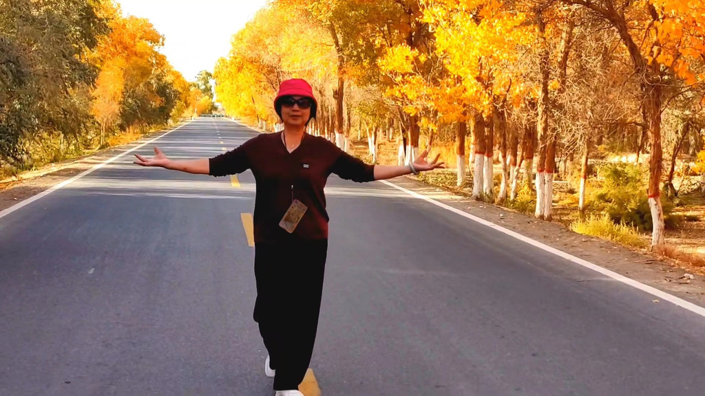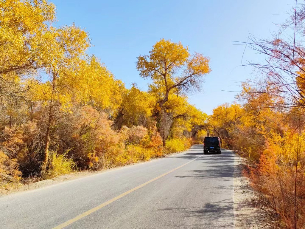 金黄的胡杨正在怒放,在一段水泥公路上两边的胡杨树,金灿灿的,在蔚蓝的天空下,显得更加夺目。小伙伴们参观完罗布人村寨后还意犹未尽,让领队停好车,现场来一段T台秀。