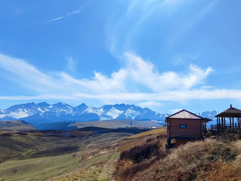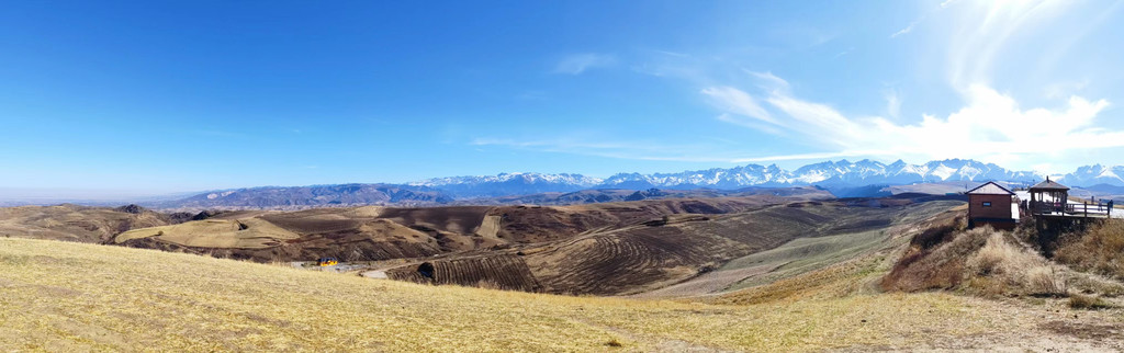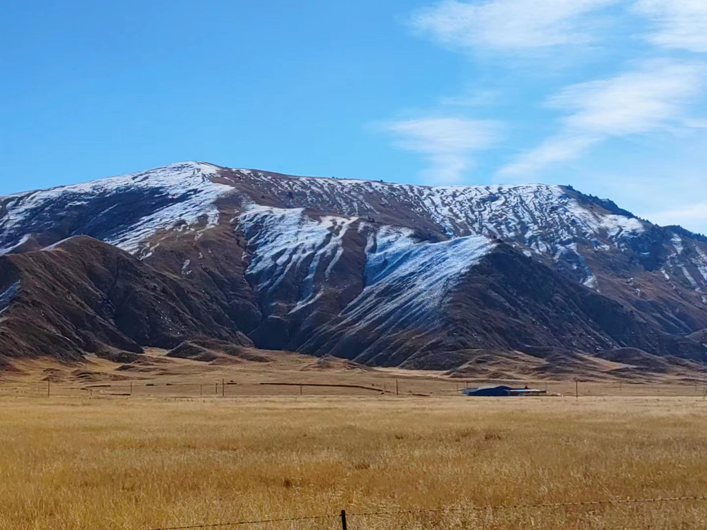早上9时,小伙伴们很有兴趣的搞了发车仪式,拉响两声礼炮后,就直奔江布拉克, 江布拉克是国家级森林公园、国家AAAA级旅游景区、被中科院确定为保护最完整的最早绿洲文化之一。有万亩旱麦田、天山怪坡、汉疏勒城、木栈道、黑湖等景点。因为是在10月中旬,万亩麦田早已收割完,田地中只剩下麦茬和刚出来的绿油油的冬麦苗,与远处的雪山相映衬,晒着暖暖的阳光,吹着略带寒意的秋风,扶凭在栈道的木栏边,闭上眼睛,吸一口略带麦秸味的空气,让人忘记了烦恼,忘记了一切不愉快的所有事。