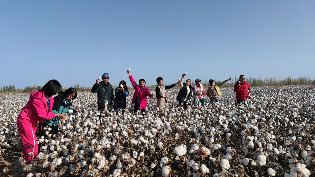 金秋正当收摘棉花的时候,沿路上看到很多棉花都已经给棉花收割机摘收好,打包堆放在棉花地里,也有一小部分的棉花没有摘收,小伙伴们也想试试收棉花的乐趣,就在一片棉田前停了下来,兴高采烈地冲进了棉花地里采摘。