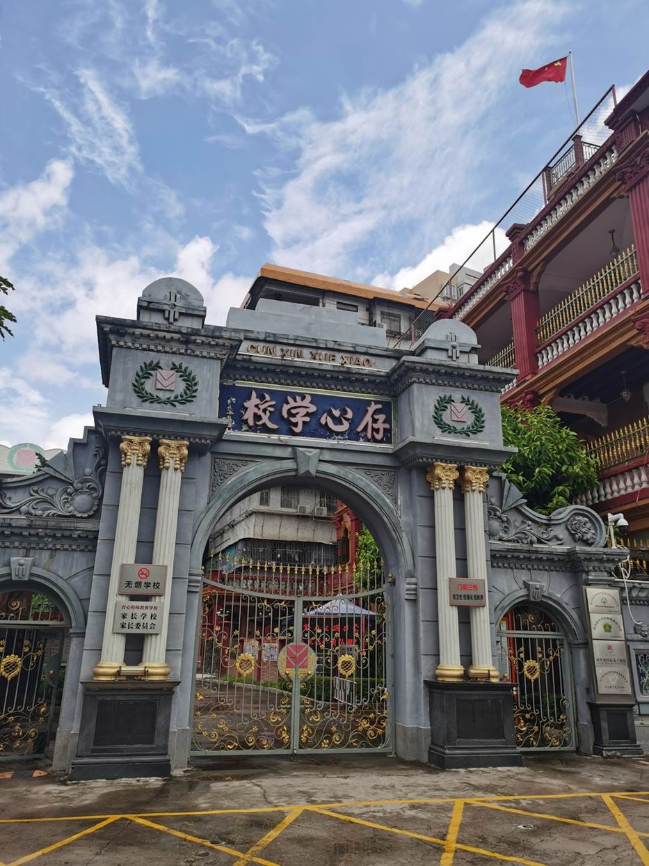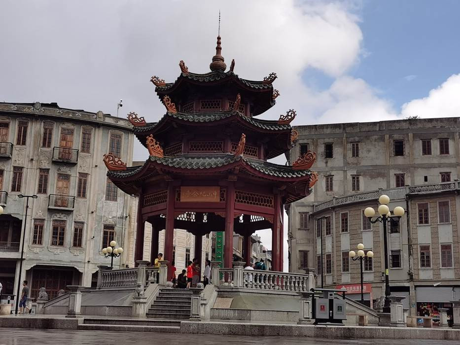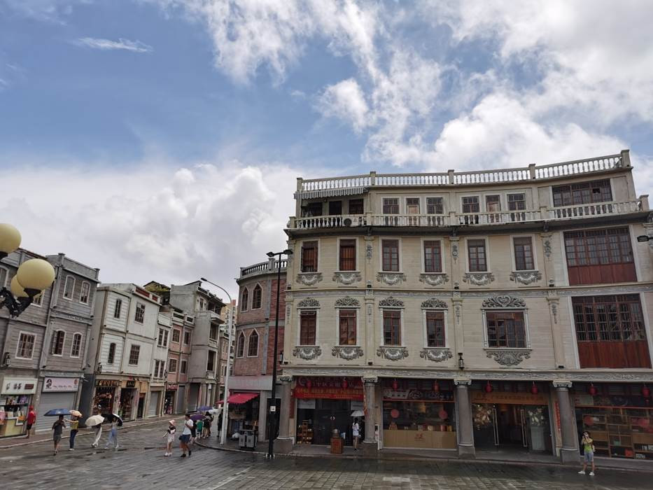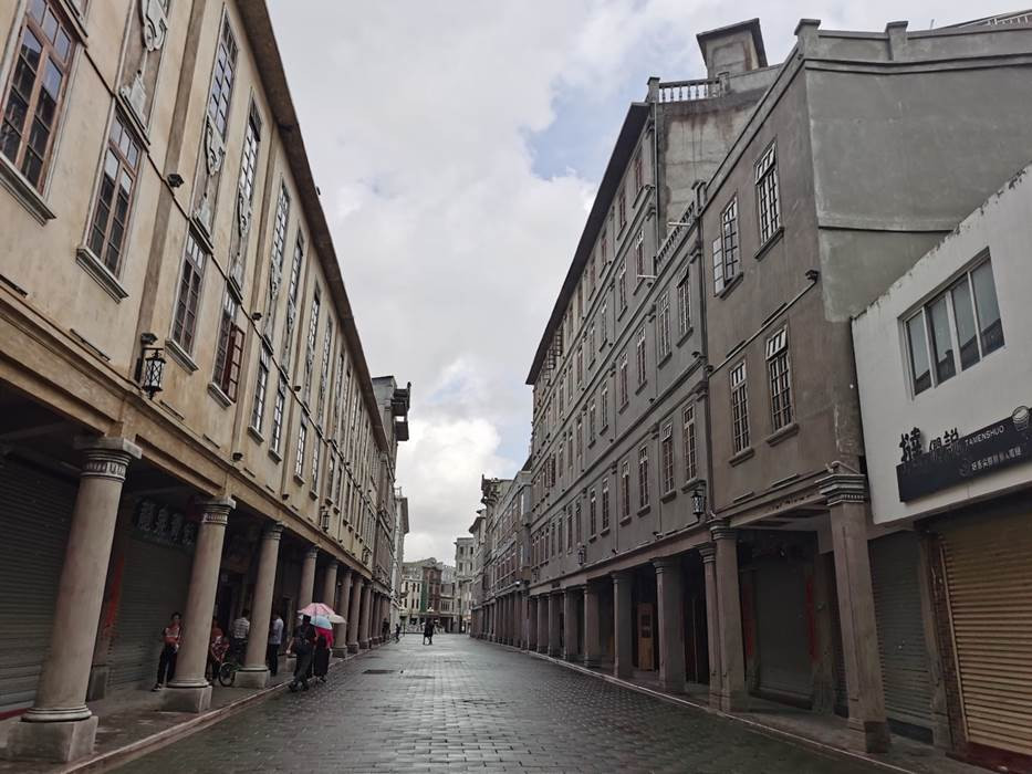 这里天空很蓝,白云朵朵的。骑楼老街就是在这里,看上去已经有一些年代了。