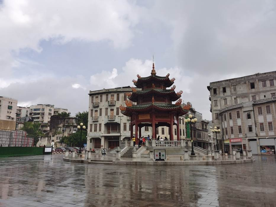 下过雨之后的街道,很湿润,空气也很清新。广场中央一座小楼,里面有几个长椅,可以坐在这里休息。