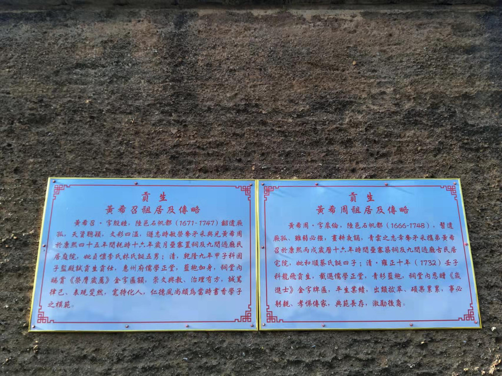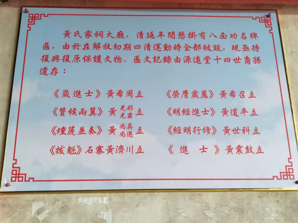《黄氏家祠》登记文物不可移动保护单位,清廷年间祠堂内悬挂有八面功名牌匾,由于在解放后四清运动时全部被毁,现亟待复兴复原文物保护。匾文记录有:《嵗進士》黄希周立,《榮膺歲薦》黄希召立,《赞候两翼》黄光彩立,《壎篪並奏》黄尚英黄尚选立,《經明行修》黄世科立,《拨魁》石寨黄济川立,《明經進士》黄道平立,《進士》黄震鼓立 。
