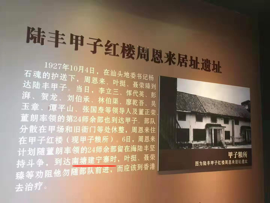 陆丰南塘镇建宁寨古村落还是红色革命旧址村落之一。据文史资料记载,陆丰文化宣传网《党史文献》1927年10月,南昌起义军撤退潮汕,3日革命前委领导人之一周恩来等在普宁流沙教堂临时紧急召开的“流沙会议”后,由县党组织负责人之一黄昌业同志引领,四日上午,在汕头地委党组书记杨石魂向导下,周恩来等革命同志跟随部队摆脱了敌人的追击之后,经钟潭村 马棚村越过大南山,一路马不停蹄到达陆丰的甲子所城内,周恩来、叶挺、聂荣臻等革命同志住宿于红楼(现在的甲子镇粮管所内),把应留下的队员留在海陆丰之外,其余的分散返回上海,撤离的队员除由甲子港就地安排船只渡港外;