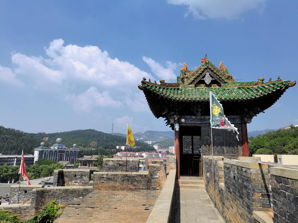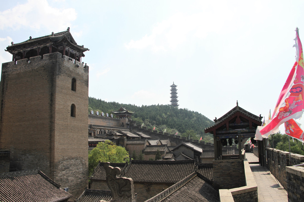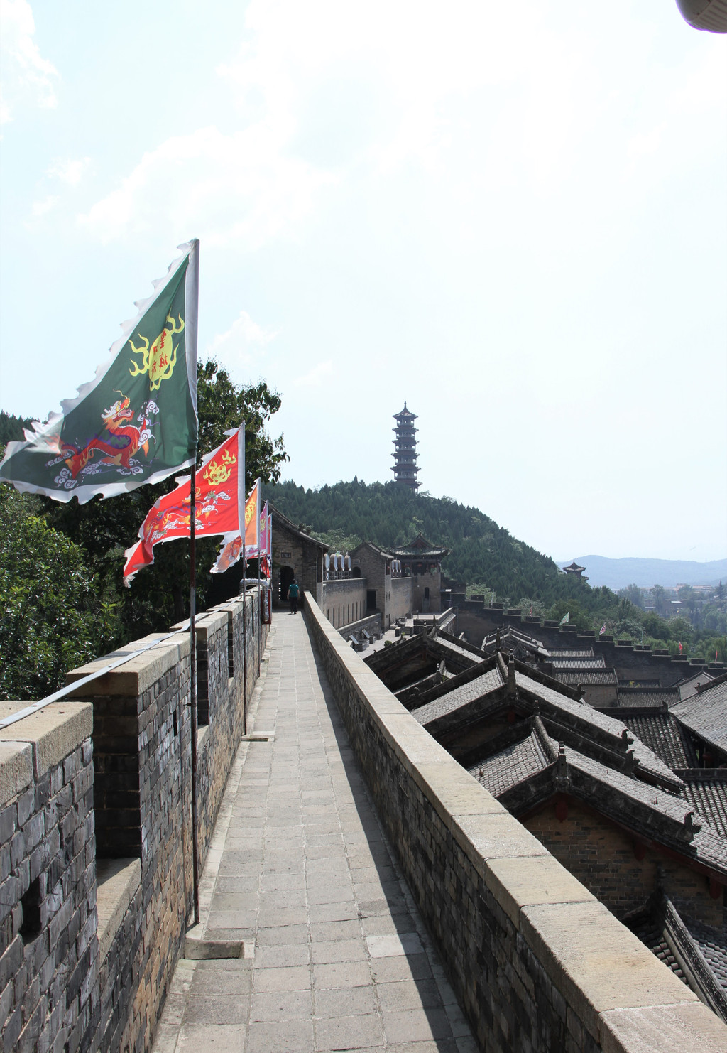 城墙之上视野开阔,旌旗猎猎,远处山顶的文峰塔高高耸立。