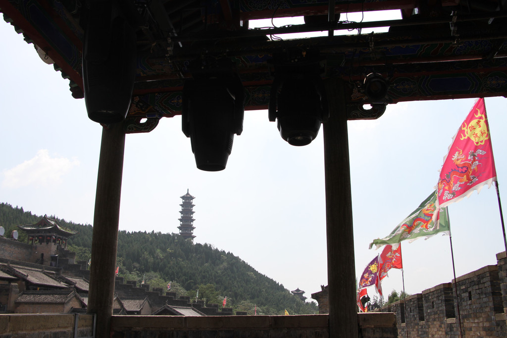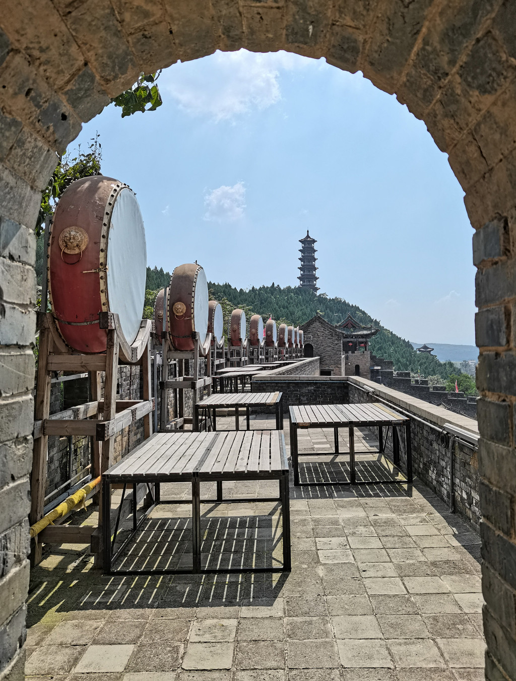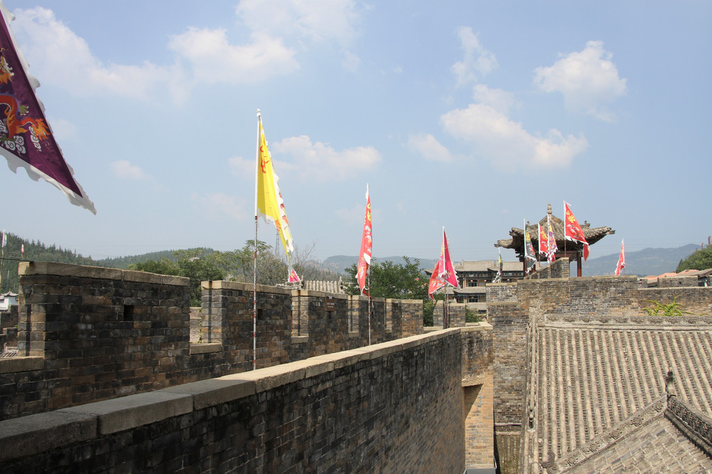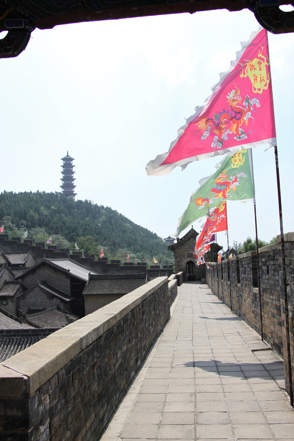 城墙之上视野开阔,旌旗猎猎,远处山顶的文峰塔高高耸立。