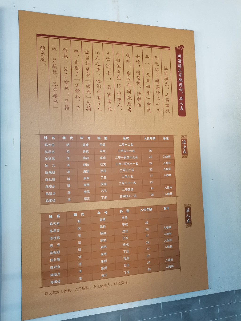 陈氏家族在明清两代,科甲鼎盛,人才辈出。从明孝宗到清乾隆(1501-1760年)间的260年中,共出现了41位贡生,19位举人,并有9人中进士,6人入翰林,享有"德积一门九进士,恩荣三世六翰林"之美誉。