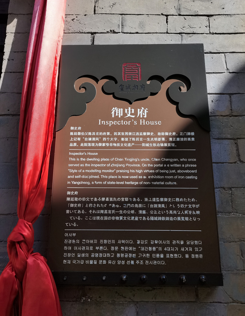 “大学士第”,建于康熙三十九年(1700年),大门开于正南,入二门为一宽敞的方形庭院,正北厅堂悬有康熙御笔牌匾"点翰堂"。