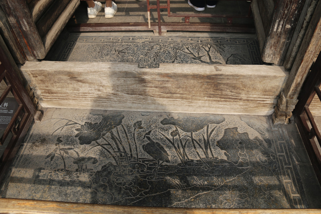 正房过门石,门坎外雕刻"一路连科",雕刻一只鹭鸶,两边有荷花,荷花又称莲花,一鹭莲荷,取谐音“一路连科”,希望子孙在科考制度下连连高中。