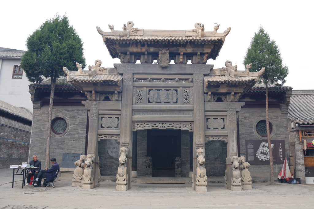 孝义祠-为奉诣旌表十五世敕封儒林郎,晋赠中宪大夫王梦鹏的孝行义举而建,总面积428平方米,孝义祠前为孝义坊,创建于清乾隆四十九年至五十一年(1784-1786年),孝义祠建于嘉庆元年(1796年),分上下两院,上院为祭祖堂、戏台,下院陈列静升王氏宗祠、王氏佳城模型以及记载王梦鹏一生孝行义举的立体雕塑,艺术价值极高。未开放。