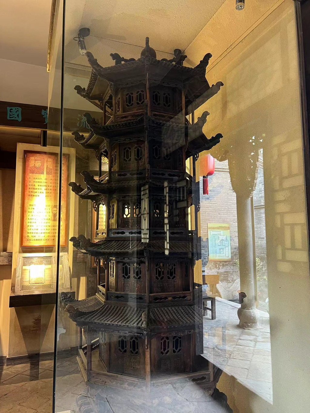 红木双塔。清代双塔,通体红木雕刻而成,商五层,取“福、禄、寿、喜、财”之意,做工精细,堪称珍品。相传是清代广西进贡朝廷的贡品。清光绪二十六年(1900年),慈禧太后和光绪皇帝途经平遥,因协同庆票号助响有功,便将双塔赏赐给了财东米秉义,米家后人败落,辗转多年后,双塔于1999年入藏馆中。
