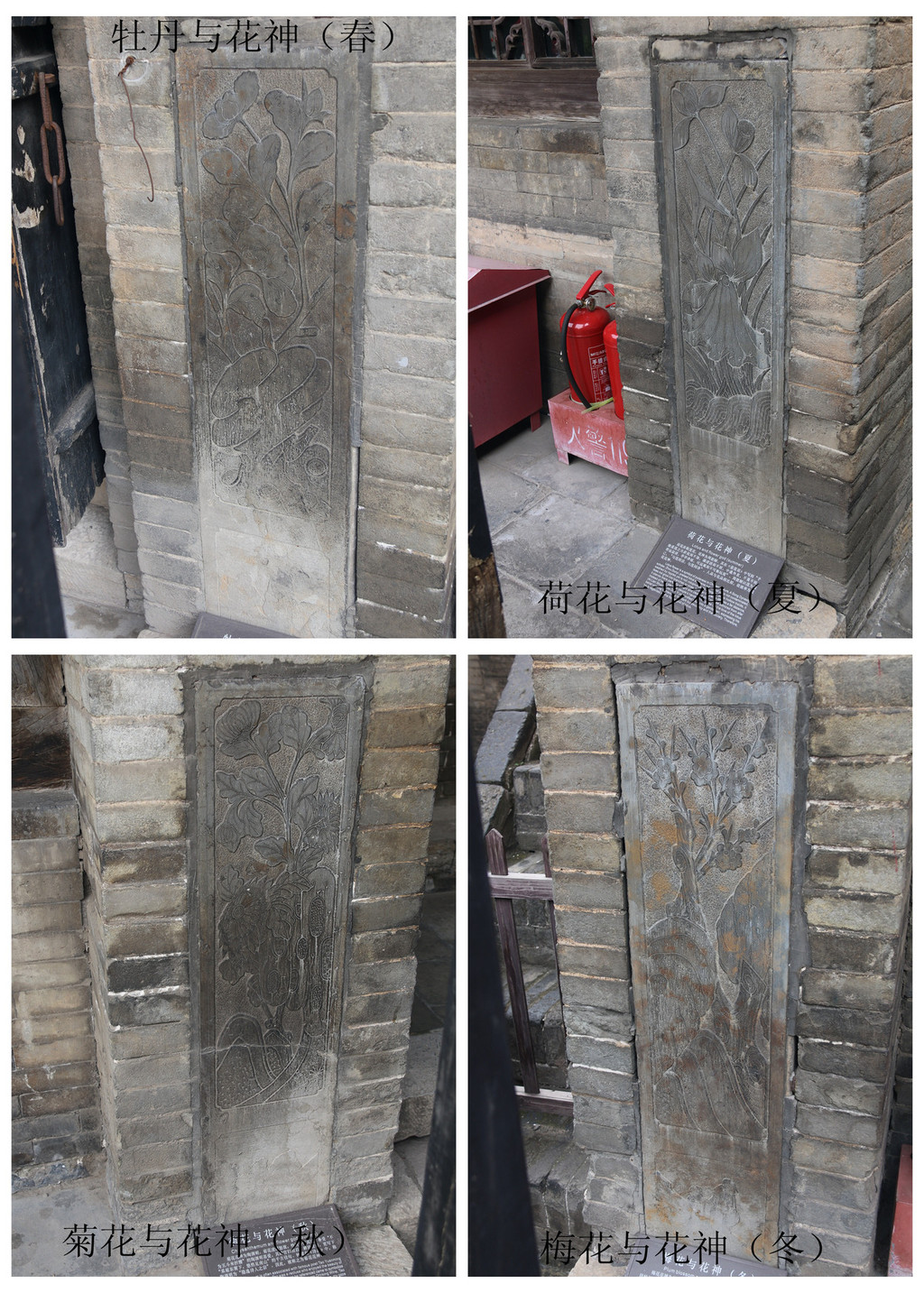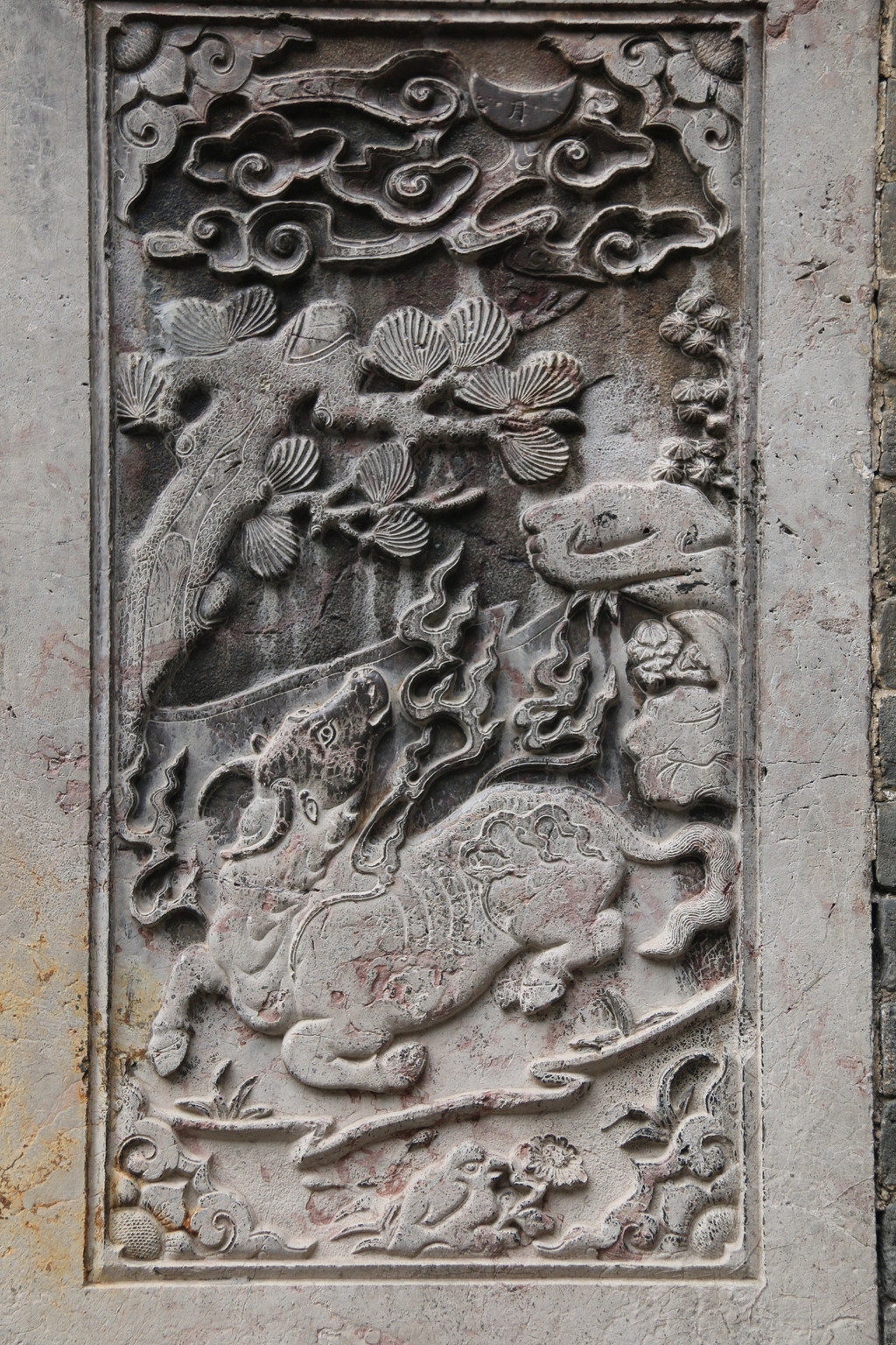 墙基石采用平面阴线手法,刻有鼎、花瓶和狮戏绣球。鼎身饰有缠枝纹,鼎盖为饕餮;瓶内插有梅花,梅开五瓣为五福,指幸福、长寿、顺利、多子、和平。瓶身为如意纹,瓶后一童子伸出半个身子探望,寓多子;下方狮戏绣球寓子嗣兴旺。整幅雕刻统一协调,给人以祥和之感。