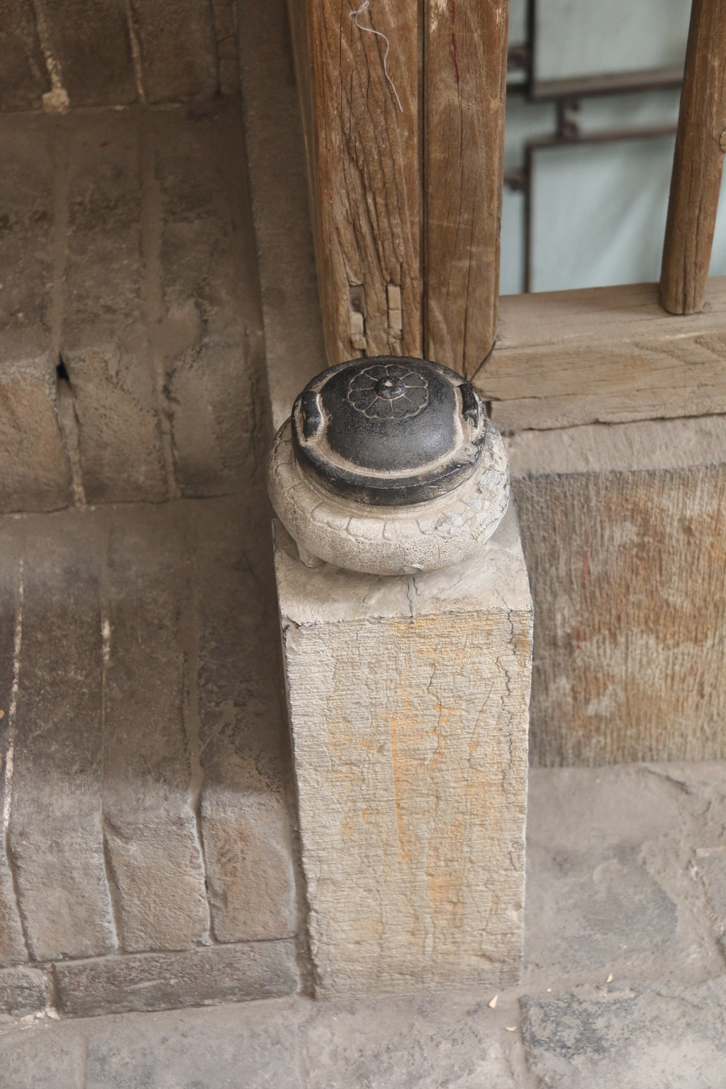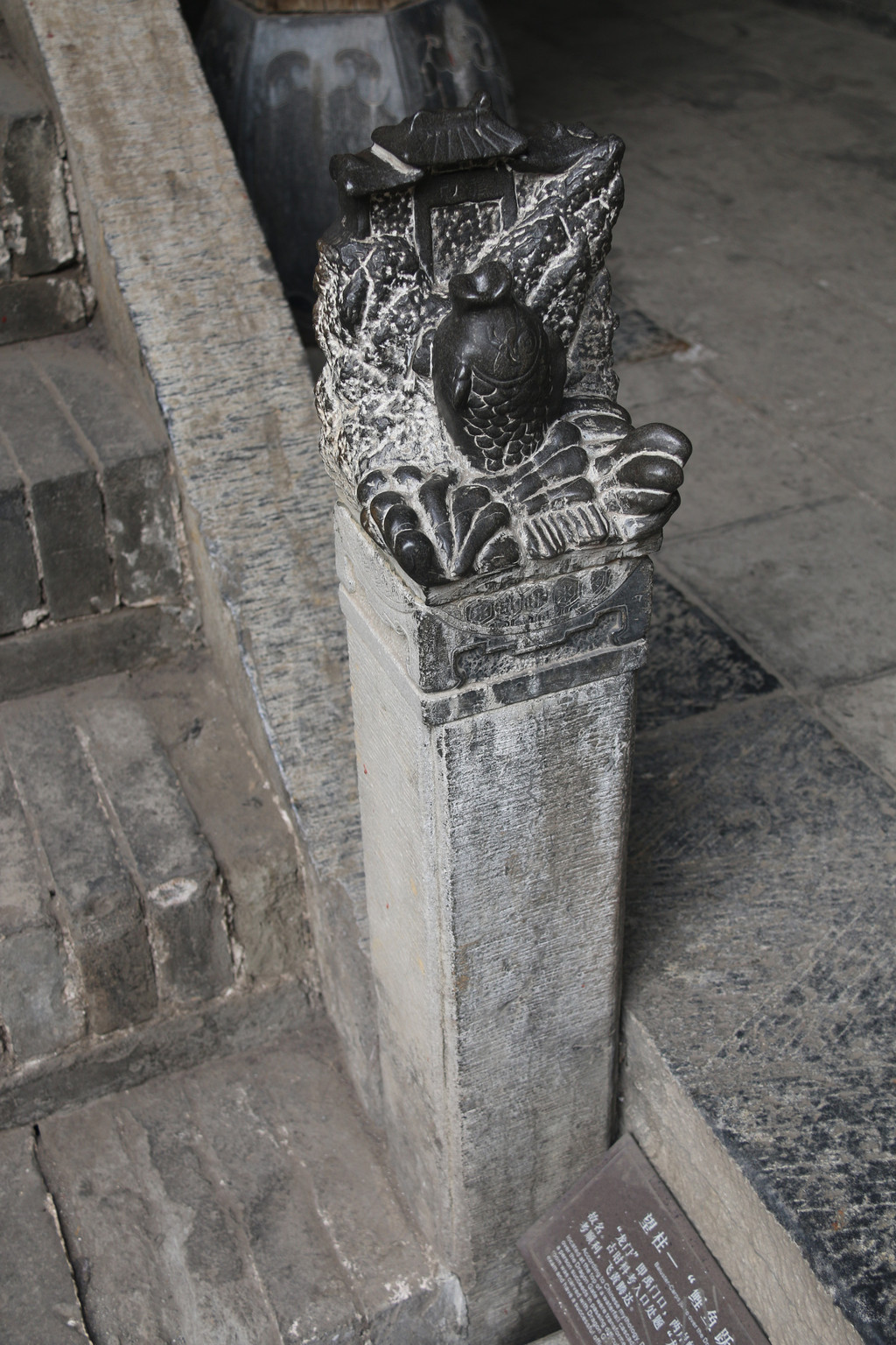 通往绣楼楼梯下的望柱:鲤鱼跃龙门。